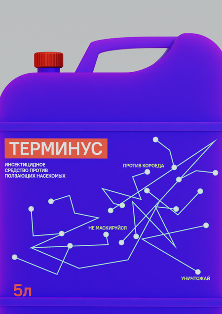 ТЕРМИНУС — инсектицид, который бьёт прямо в цель. Он не прячется, не маскируется — его видят, его узнают, и именно он спасает ваш сад от любой угрозы. Яркие, химически дерзкие цвета заявляют: это оружие, а не компромисс. Каждый вредитель — свой цвет. Простая линейная графика с точками-наводками усиливает ощущение точности и атаки.