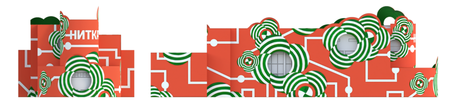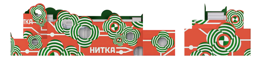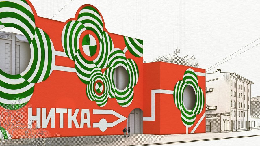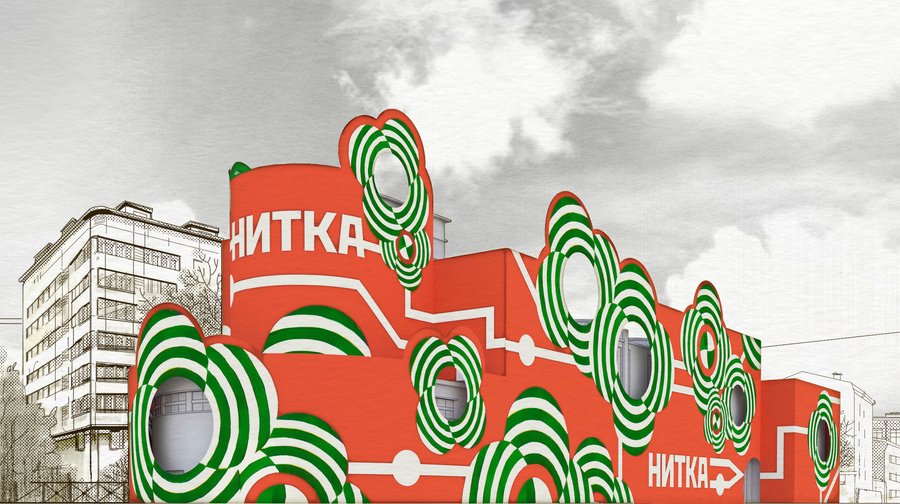 НИТКА 2.0 — проект оформления временных фасадов для выставки Варвары Степановой «НИТКА». Как и сама неистовая амазонка авангарда, выставка неоднозначна по настроению.