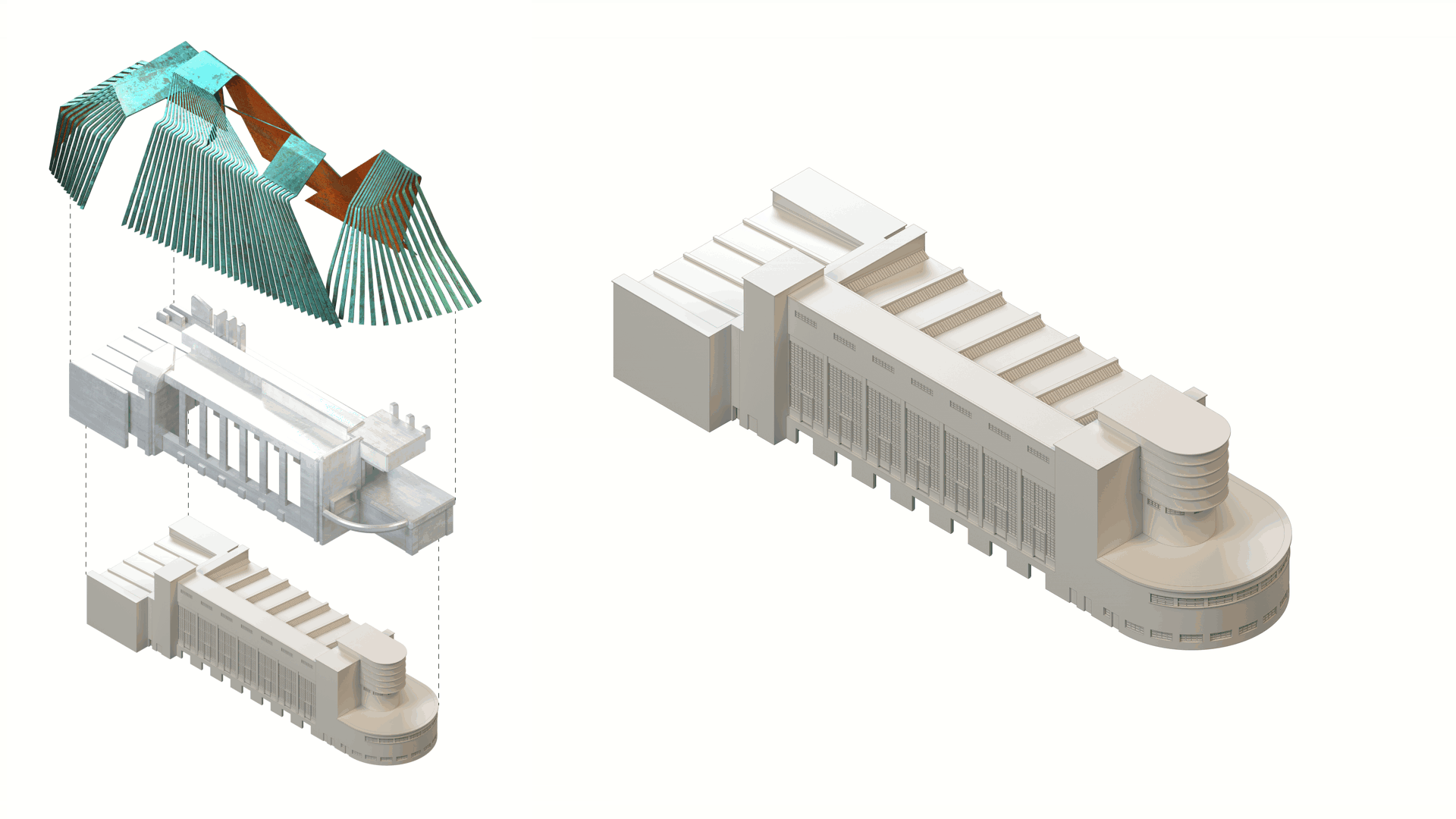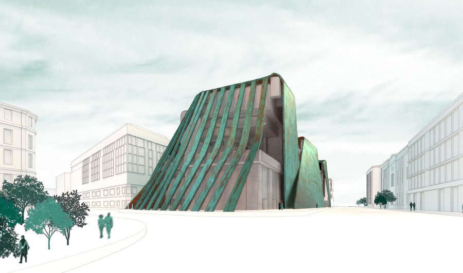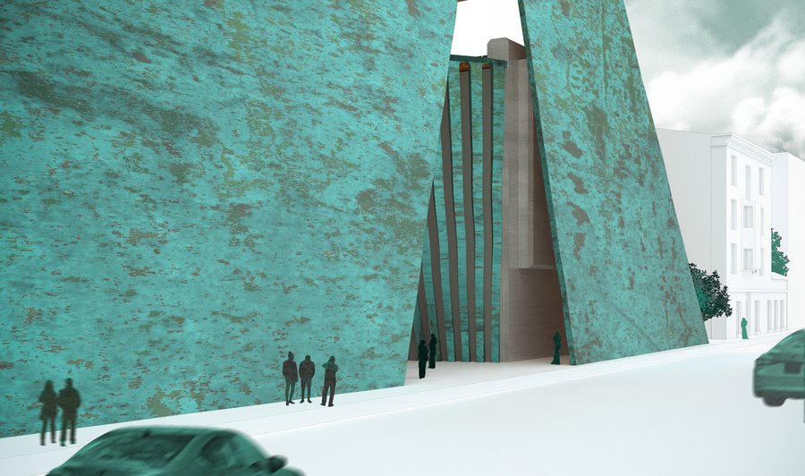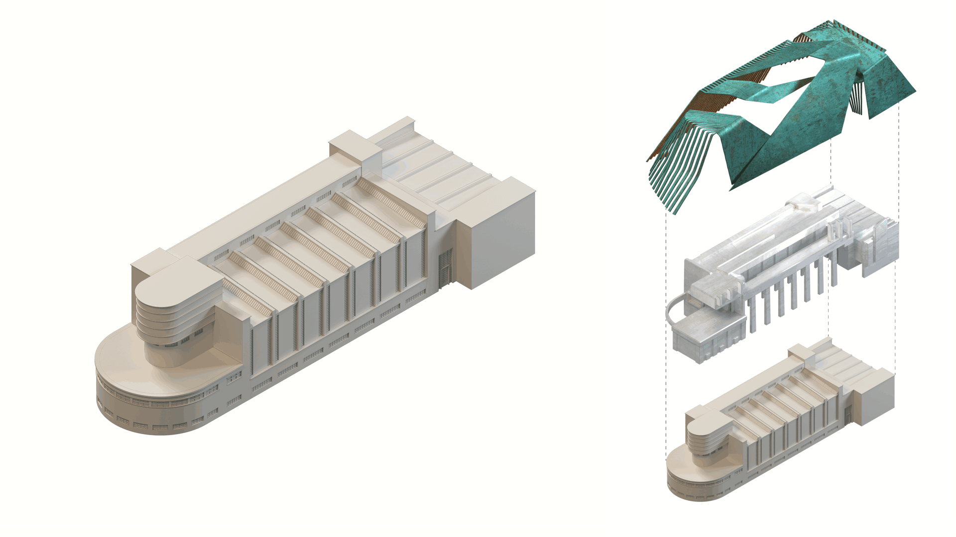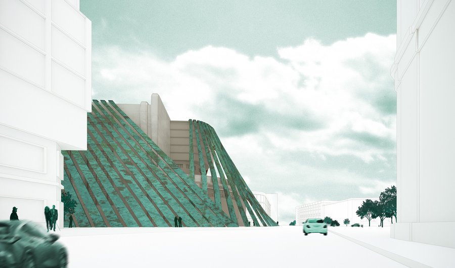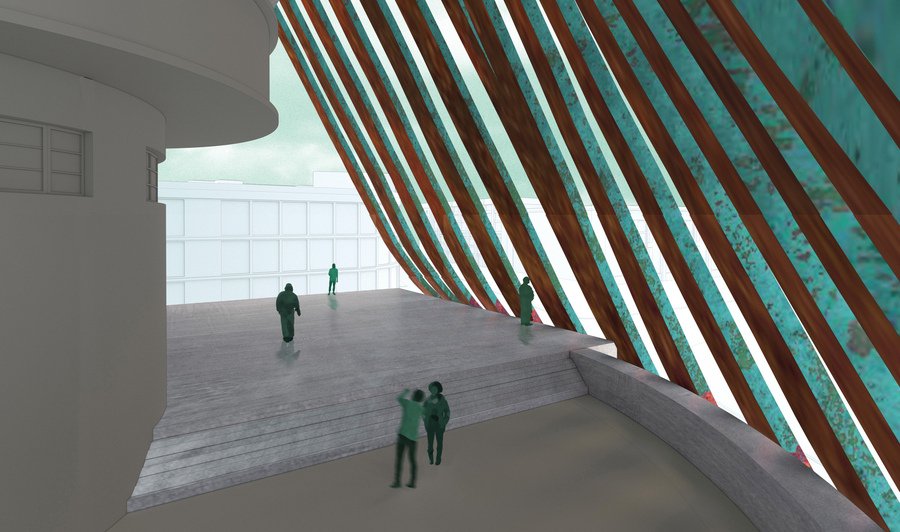 Идея оформления основана на связи с текстильным производством. Фасад метафорически состоит из металлического промышленного ткацкого «станка-чехла», и «ниток-лент», сходящихся в полотна ткани, покрывающие здание.