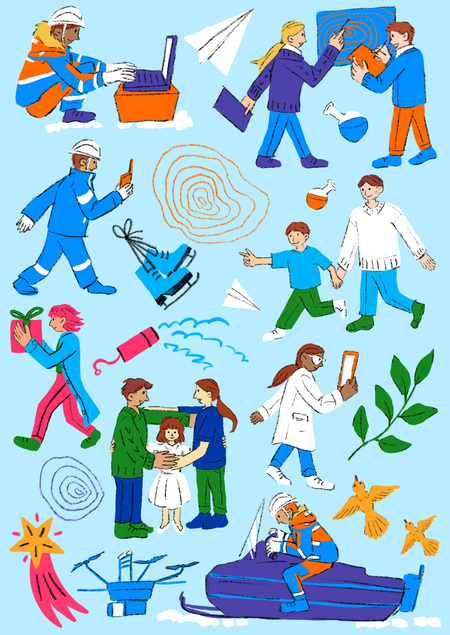 Включение в иллюстрации человеческих фигур, показывая обстановку, которая им близка, не только в плане обывателя, но и в плане работников компании. Яркие цвета поддерживают тематику энергии, исходящей от людей, а диджитал живопись добавляет выразительность и витальность в иллюстрации.