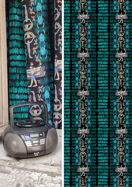 Автор: Гаврилина Варвара Сергеевна. Ткань «Скарабеи» Концепция: Коллекция «Египет» выполнена в конце 2023 года. За время моей работы в сфере дизайна, искусства, креатива я поняла, что многие мои произведения воспринимаются людьми неожиданно для меня, иногда даже негативно. Подчас в процессе обсуждения выясняется, что тому причиной становится невнимательность к деталям изображения или банальное не знание истории, истоков, культуры древних народов. Многие знают только то, что им внушает современное СМИ и не смотрит глубже, не интересуются сверх того, что передают по «ящику». Я считаю, что одна из важнейших миссий художника — рассказывать историю, поэтому я создала эту коллекцию, где используются образы древнего Египта, как напоминание в современной интерпретации и технике. Функция: Гардины для дома, ткань для интерьера, декоративная ткань. Целевая аудитория: средний класс, интересующийся современным искусством, желающий сделать свои интерьеры оригинальными и яркими. Техника: сублимационная печать на габардине авторских изображений, выполненных вручную в технике акварель и соединенных в бесшовный паттерн в программе Adobe Photoshop. Размеры: 1*3 метра Год создания: 2023