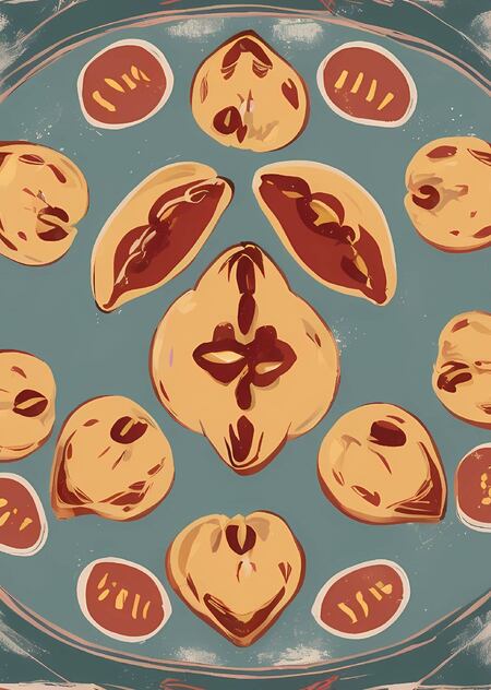 Промпт: Abstract, bright pattern for scarves depicting pierogki, pirogi made by grandma. Limited color palette: 98AF85, FAE0AE, D54E2C, A91600. Использованные инструменты: Leonardo AI, Upscayl