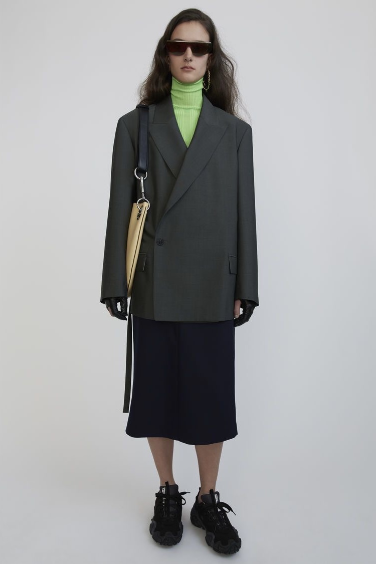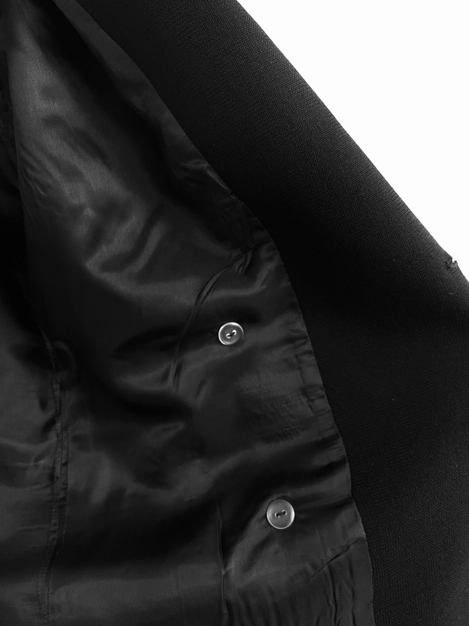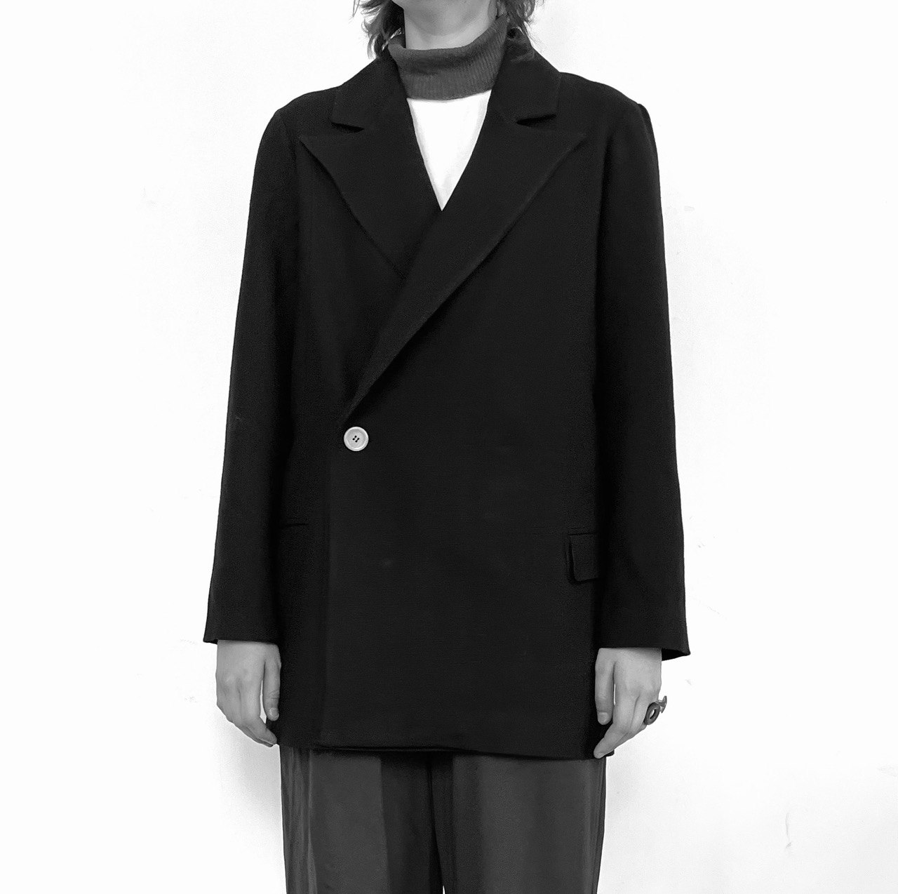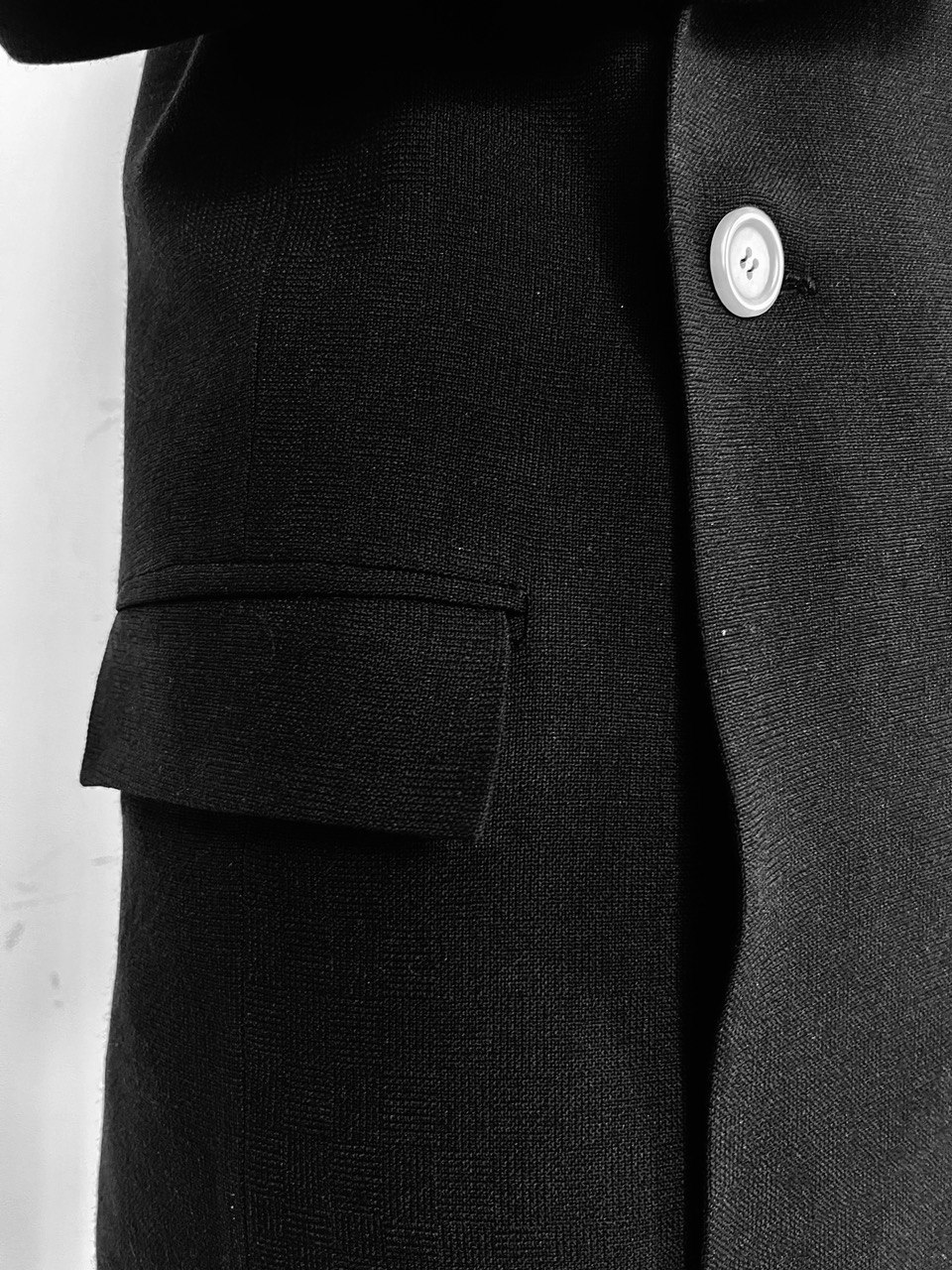 Силуэт прямой с втачным рукавом, двубортной застежкой на одну обметанную петлю и одну пуговицу с внешней стороны и две обметанные петли и две пуговицы с внутренней стороны. Длина ниже линии бедер.