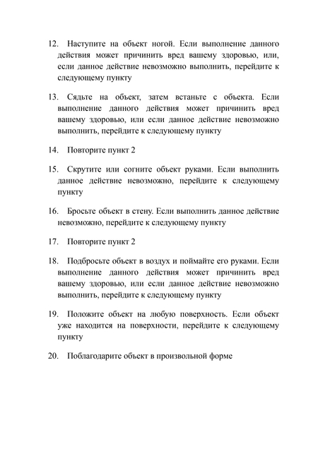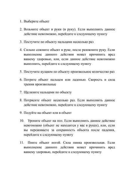 Партитура состоит из 20 пунктов с подробными действиями, направленными на взаимодействие с выбранным объектом. Каждый пункт подразумевает индивидуальную интерпретацию, основанную на доступности объекта и физических возможностях исполнителя.