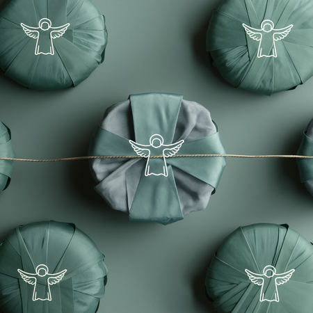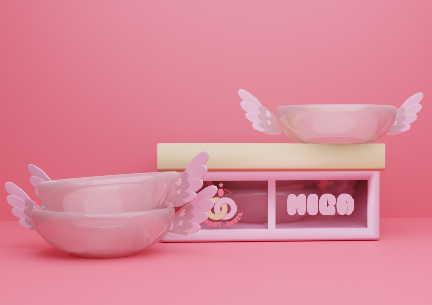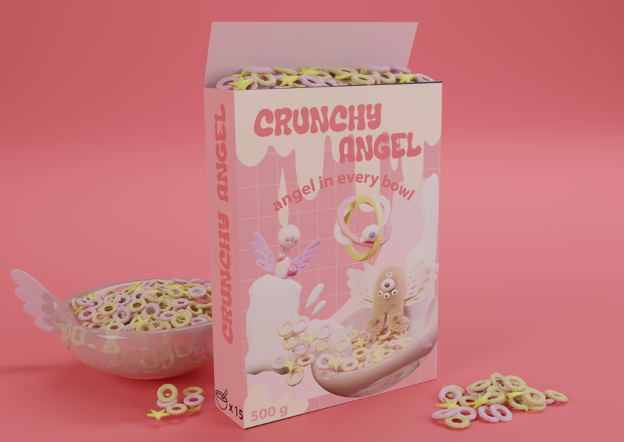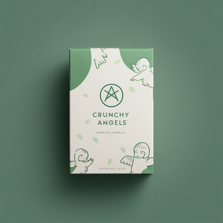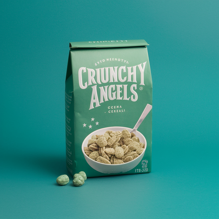 Логотип: Logo for packaging of cereals with the name «Crunchy Angel» Постеры: Posters for cereal packaging with angels in greenish-blue colors Мерч: Toys in packages of cereals in the form of Seraphim Упаковки: Minimalistic packaging for cereals in greenish-blue colors «Crunchy Angel» Пространство: Shelves in a store with packages of Angel Crunch cereal in blue colors