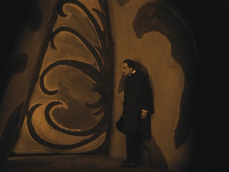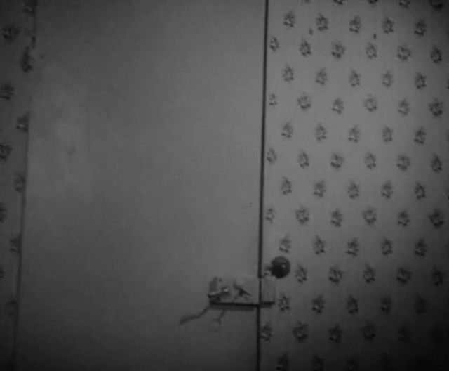 В «Кабинете доктора Калигари» дверь функционирует как визуальный маркер, отделяющий безумие от реальности. Однако эта граница оказывается зыбкой, поскольку все пространство фильма представлено через субъективное восприятие героя. Так, в сцене с домом доктора Калигари дверь подчинена остальным декорациям, ломанной перспективе и отсутствующей симметрии, благодаря чему все строение выглядит неустойчиво. Архитектура зданий на улицах города также лишена логики и деформирована, а дверь в лечебницу неестественно высока и ритмически согласована с перекошенными окнами, что визуально усугубляет ощущение иррациональности и тревоги.
