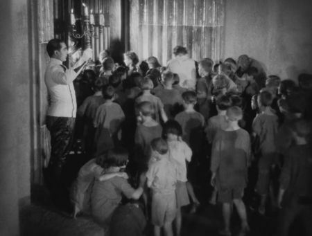 Эта граница визуализирована ярче всего в сцене с самопроизвольно распахивающейся дверью в замке Орлока. Ее вытянутая, готическая форма с заостренным верхом одновременно напоминает церковный портал и вход в склеп. За ней зияет беспроглядная тьма, а виньетирование по краям экрана дополнительно фокусирует внимание. «Мурнау нацеливает объектив камеры на дверь, за которой поджидает погибель». [4]