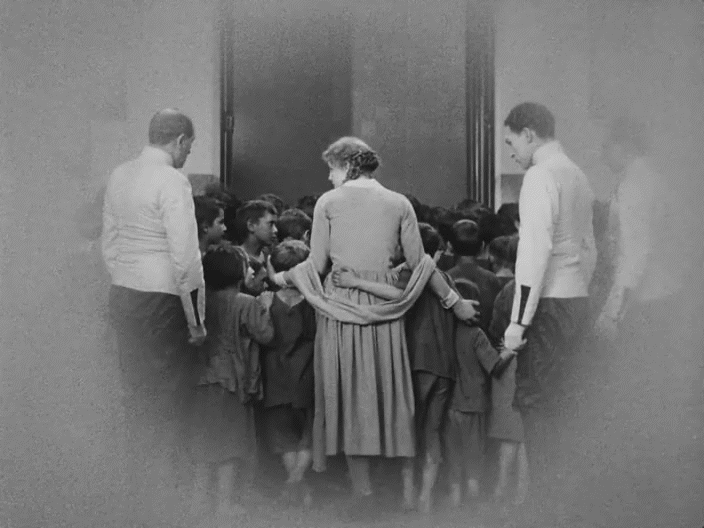 Сцена с толпой, направляющейся к двери собора — «Метрополис» («Metropolis», реж. Фриц Ланг, 1927 г.)