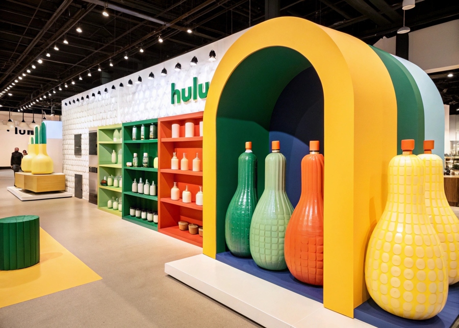 Так как основная идея бренда заключается в кастомизации и самовыражении, каждый магазин Hulu представляет собой уникальную композицию, состоящую из разнообразных абстрактных форм и текстур.