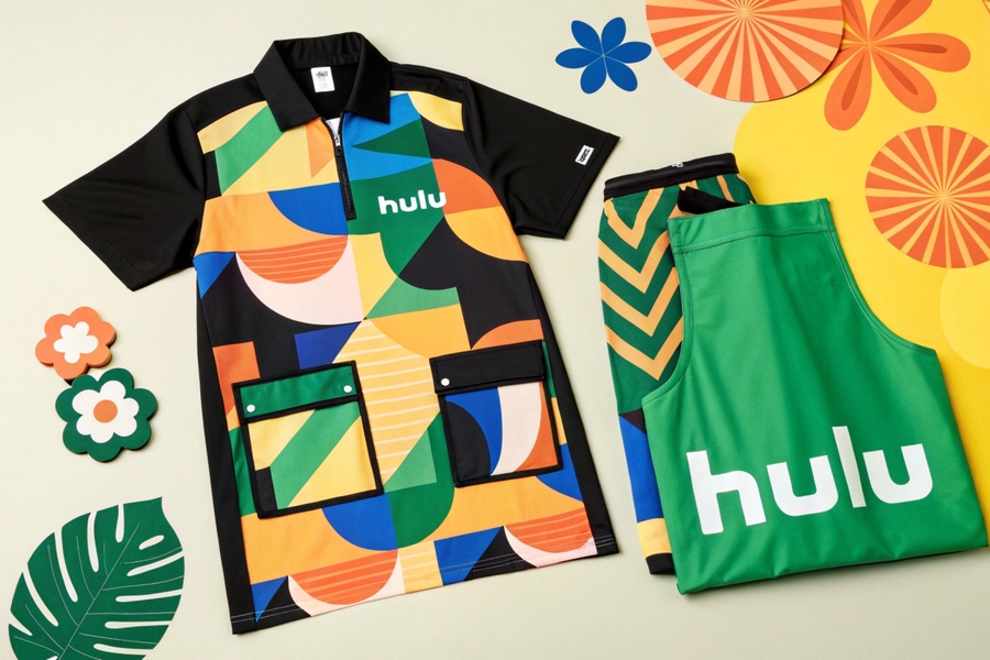 2)Prompt: A design concept for a staff uniform of brand HULU. It should feature vibrant colors that emphasize modularity and the ability for customization, allowing for self-expression and showcasing the brand’s uniqueness. Incorporate a variety of abstract, minimalist shapes that collectively form patterns and modular design blocks. Background should be colorful but simple and muted to highlight package. A decorative abstract shapes placed around items.