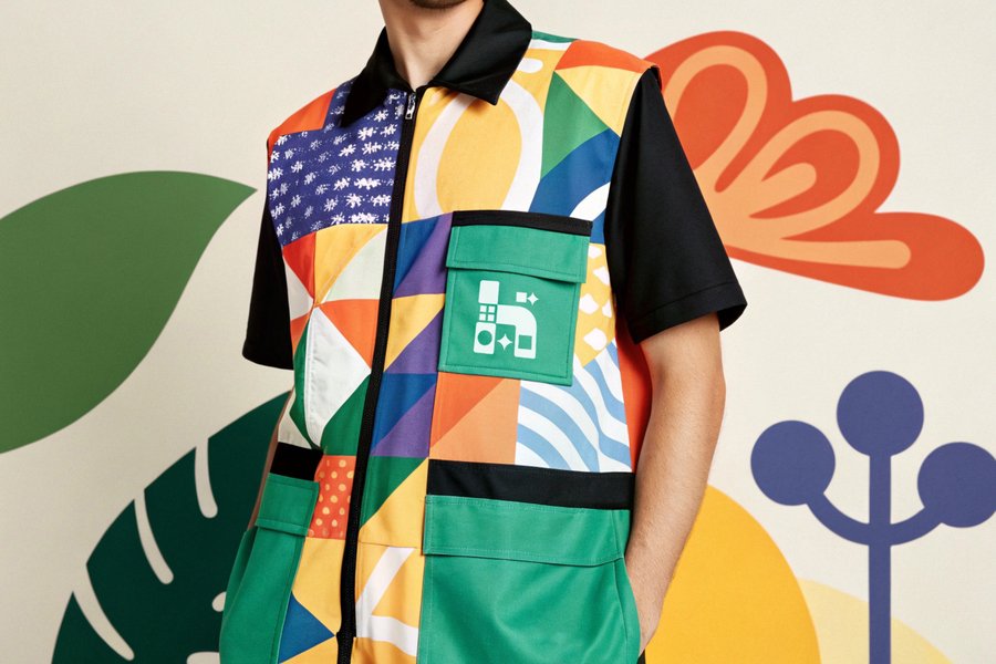 1)Prompt: The uniform should incorporate vibrant colors that emphasize modularity and the ability for personalization, allowing employees to express themselves and showcase the brand’s uniqueness. It is important to use a variety of abstract, minimalist shapes that collectively form patterns and modular design elements.
