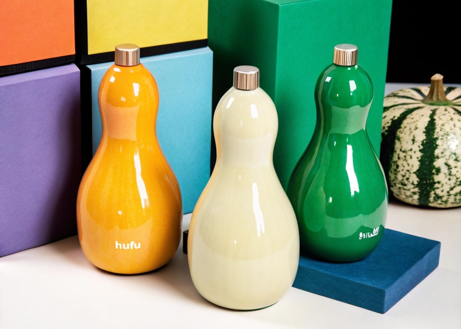 Prompt: A photorealistic close up shot of minimalist bottles made in shape of hulu gourd bottles. The overall aesthetic is clean, modern, and vibrant, reflecting an innovative and customizable brand.