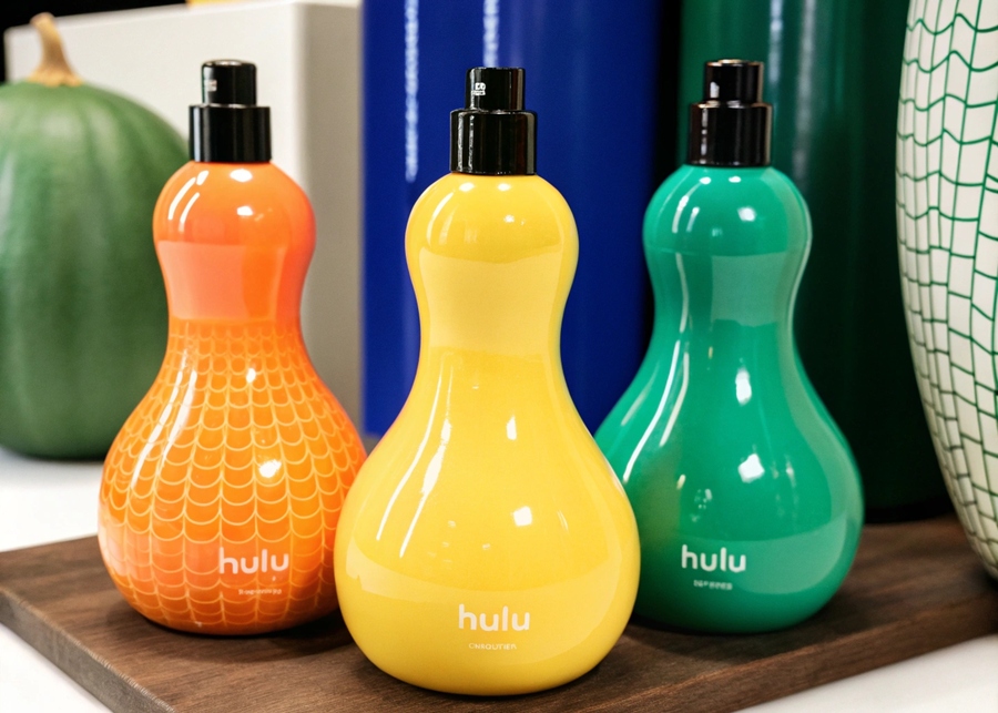Prompt: Create a portfolio cover for the brand Hulu — bottles shaped like bottle gourds. The design should feature clean, minimalistic text blocks that succinctly describe the company, complemented by vibrant colors that highlight themes of modularity and customization. This approach will promote self-expression and showcase the brand’s uniqueness.