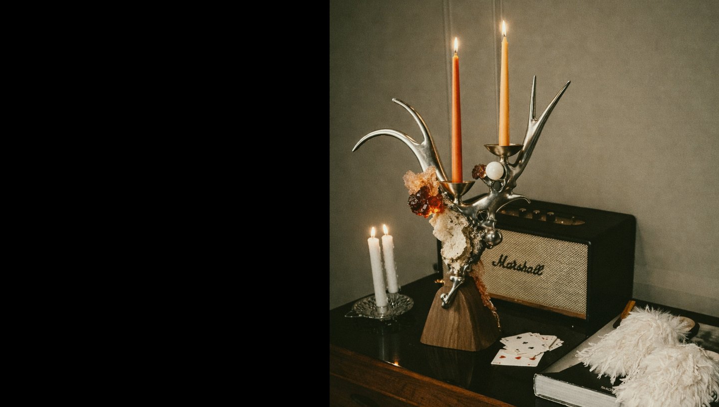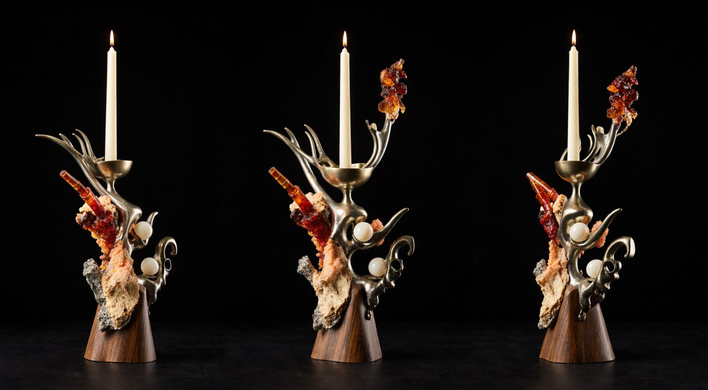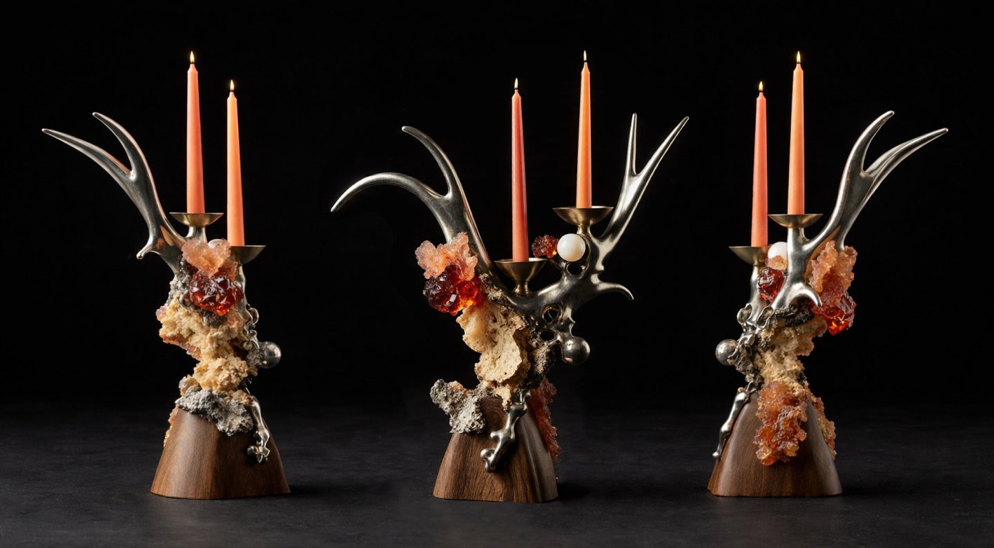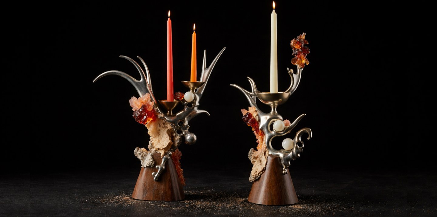Две скульптурные подставки для свечей из тёмного металла с органичными формами — как ветви или рога. Каждая рассчитана на одну или две свечи, удерживаемые в латунных чашах. Дополнены текстурными элементами: кусочками камня, жемчугом, оранжевым пористым материалом и деревянной основой. Функциональны, устойчивы, подходят для создания атмосферы — дома, в интерьере.