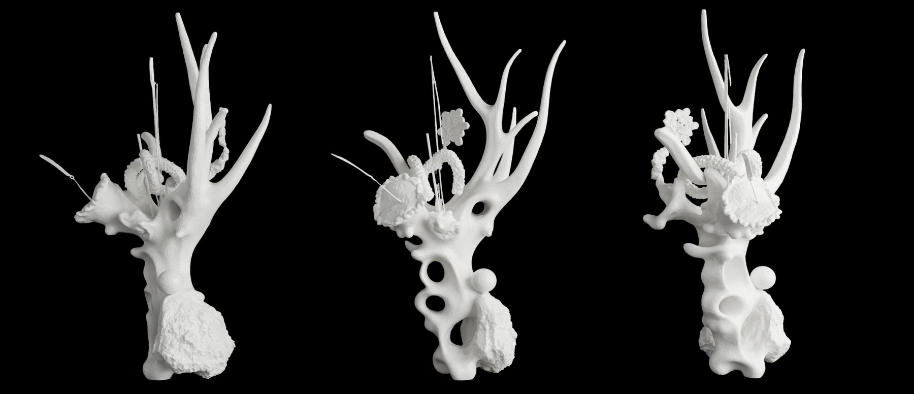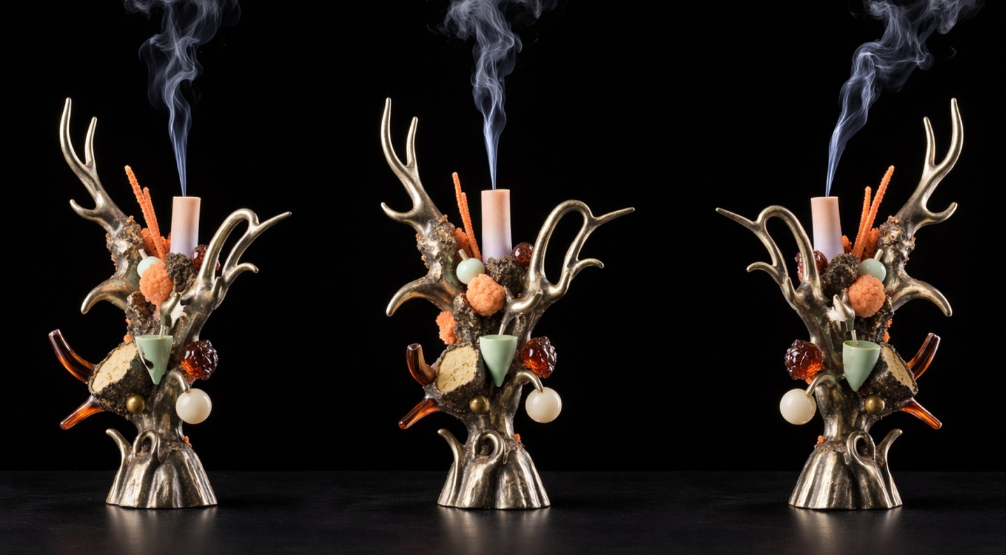 Первая серия из двух подставок создана для благовоний-конусов. Скульптурные формы под темный металл с органичными изгибами, дополненные вставками жемчуга, пастельного пластика и керамики. Каждая подставка удерживает благовоние под идеальным углом, позволяя дыму свободно подниматься. Созданы как функциональные объекты для повседневного ритуала.