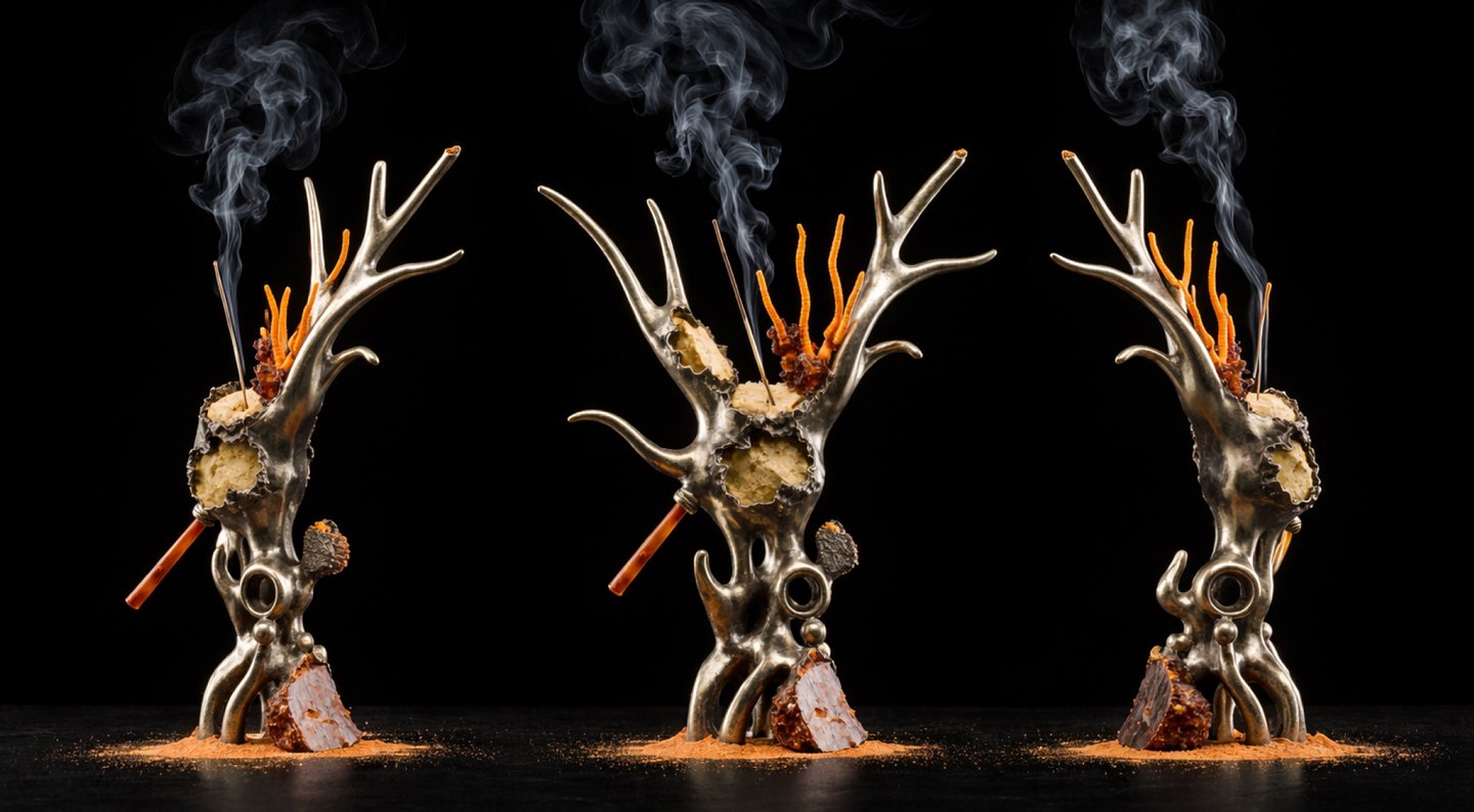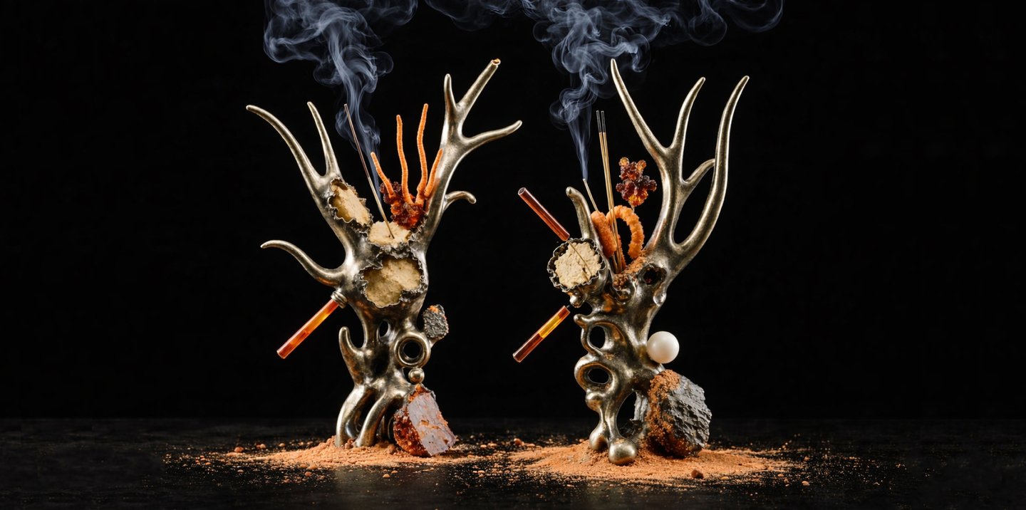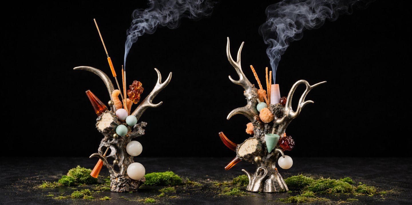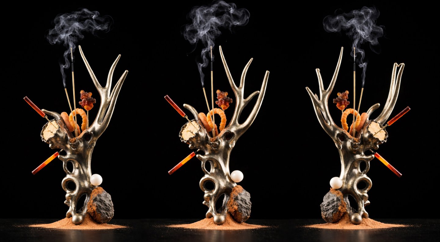 Третью серию из 2 объектов составляют 2 подставки для благовоний-палочек. Обе выполнены под единый материал: тёмный металл с асимметричной, природной формой и вкраплениями неоднородных материалов — от гладкого жемчуга до пористой керамики и камня. Конструкция обеспечивает устойчивое положение благовония и свободное рассеивание дыма. Предназначены для медитативного или повседневного использования.