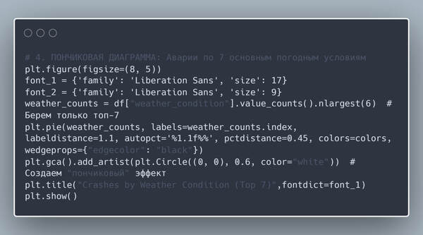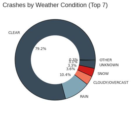Пончиковая диаграмма показывает, что абсолютное большинство происшествий случилось в ясную и хорошую погоду, лишь 10,4% процента произошло в дождь, облачность и снег набрали лишь около 3%.