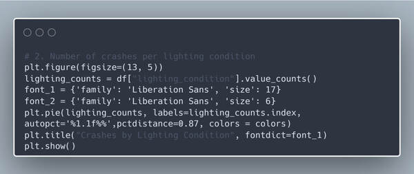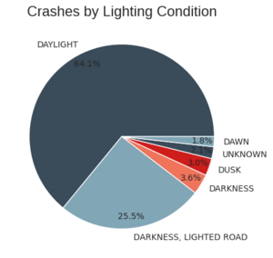 На круговой диаграмме ясно виден контраст: она показывает, что больше половины аварий произошло при дневном свете, меньше половины на освященной дороге в темноте, и лишь 6,6% в сумерках и темноте.