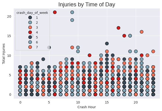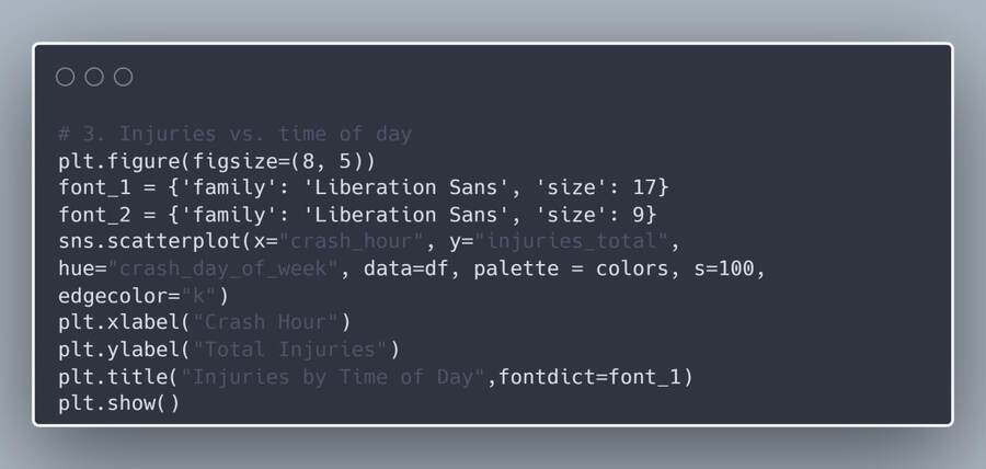 На точечном графике более удобно увидеть разницу между днями недель, в которые произошли аварии. Большинство из них не несут много урона, распространены они равномерно, нет определенного часа или дня в которых ДТП было бы гораздо больше, чем в другие, однако незначительно снижаются происшествия примерно с 10 часов вечера до часу ночи и в 4 часа утра.