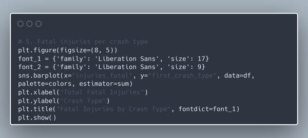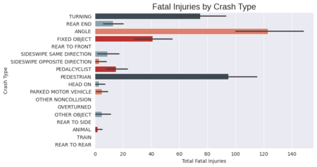 Горизонтальный столбчатый график с полосами погрешностей показывает, что причинами большой смертности в авариях являются во-первых угол (подъем или спуск), (он также являлся лидером и в первом столбчатом графике), во-вторых столкновения с пешеходами, их количество не такое большое, но часто фатальное. И в-третьих повороты, которые также вошел в тройку распространенных в графике выше.