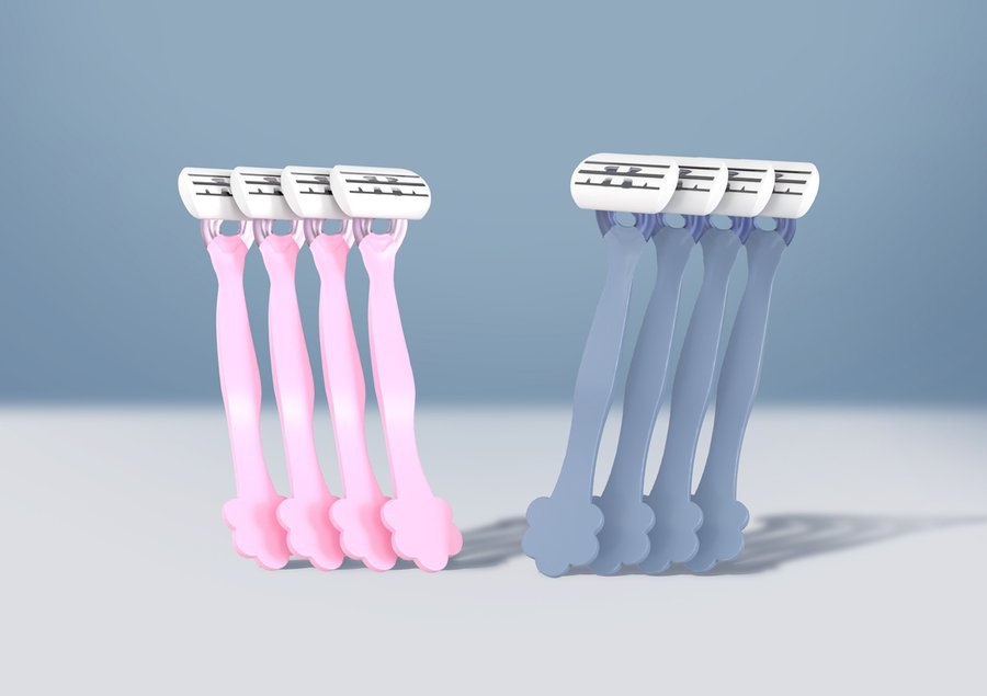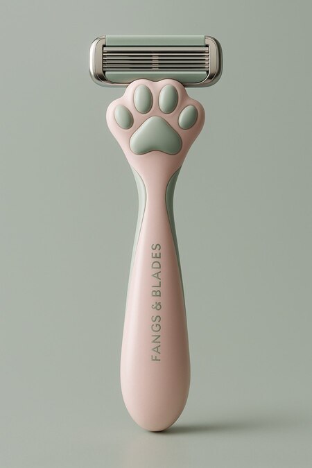 Feminine razor for brand Fangs & Blades, pastel pink paw shaped handle with muted green accents, sleek modern curves, looks elegant and soft, gentle reflections.