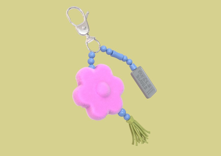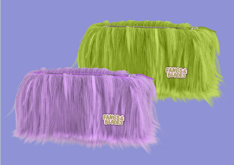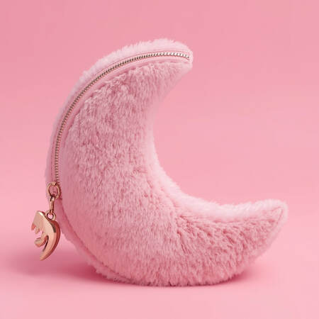 2.A semi-circular cosmetic bag shaped like a crescent moon. Made of artificial pink fur. Features a zipper with a small, shiny metallic fang-shaped charm that adds a sharp, stylish detail. The style should be modern, cute and product-focused. Pink background, soft lighting, product shot, 3D render.