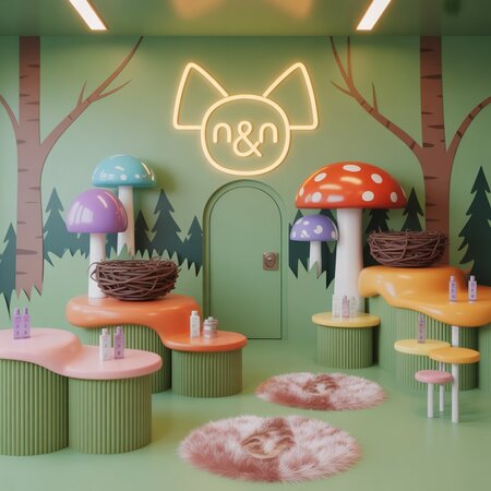 1. Entrance Zone: «The Introduction Glade» · Entrance Door: Shaped like a stylized wolf’s muzzle with a smile, where the door handle is a razor blade. · Facade: A glowing neon sign with the logo, where the lights twinkle in an ampersand-shaped flower. · Doormat: A fluffy doormat resembling a giant paw print. 2. Main Retail Area: «The Forest Clearing» · Furniture: · Hill-Tables: Tabletops with a wavy form, painted in soft pastel colors (mint, lilac, peach). · Mushroom-Shelves: Low shelves shaped like cartoon mushrooms, with products displayed on their caps. · Nest-Displays: Rounded display cases with soft lighting, where products rest like precious eggs. 3. Testing Zone: «The Stream of Smoothness» · Countertop: Mimics a flowing stream with blue-toned lighting. · Seating Poufs: Shaped like polished river stones, but soft and comfortable. · Mirrors: In carved frames where the top part features wolf ears and the bottom has curling stems with flowers. 4. Rest Zone: «The Den of Coziness» · A nook with a large paw-shaped pouf for sitting and browsing your phone. · Photo Installation: A wall with a huge butterfly wing that shimmers in the brand’s colors, or a large 3D flower you can step into as if it were a bud.