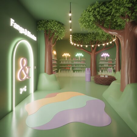 · Main Colors: The same as in the brand identity: soft lime, lilac, mint, peach. · Flooring: Light parquet or matte wood-look tiles with inlaid paw prints. · Walls: Plastered walls painted in pastel tones with frescoes: flying razors with little wings, wolf cubs playing with shaving foam clouds. · Lighting: · General: Soft, diffused light from ceiling panels shaped like clouds. · Accent: Warm yellow lighting for the shelves. Spotlights shaped like flowers.