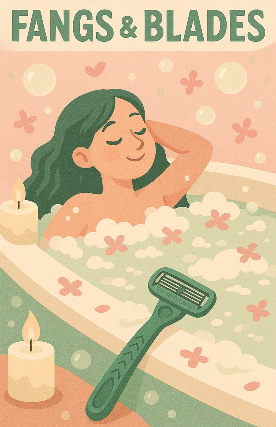 1. Illustrated poster, soft pastel aesthetic, rounded shapes, soft shading, storytelling composition, brand colors pastel pink and muted green, playful brand mood, expressive characters, cinematic framing, magazine-quality layout, high resolution, no photography — stylish digital illustration. Girl relaxing in bathtub full of foam and flower petals, Fangs & Blades razor on edge of bathtub, candles and soft bubbles around, dreamy soft mood, pastel composition, peaceful self-care moment.