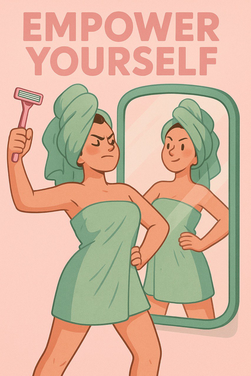 3.Illustrated poster, soft pastel aesthetic, rounded shapes, soft shading, storytelling composition, brand colors pastel pink and muted green, playful brand mood, expressive characters, cinematic framing, magazine-quality layout, high resolution, no photography — stylish digital illustration.Girl stands in front of mirror in confident heroic pose, holding razor like a sword, playful feminist energy, green towel wrapped around her hair, slogan space above. Fun, bold, humorous empowerment.