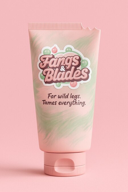 Soft pastel squeeze tube with watercolor fur-like gradient texture, pastel pink base with sage green brush strokes, subtle bite-mark cutout on label shape, playful handwritten text. 'For wild legs. Tames everything.' Feminine werewolf-inspired beauty brand aesthetic, pastel pink and green color palette, soft vector or semi-3D illustration style, matte surfaces, cinematic lighting, high detail, soft shadows, aesthetic product photography style.