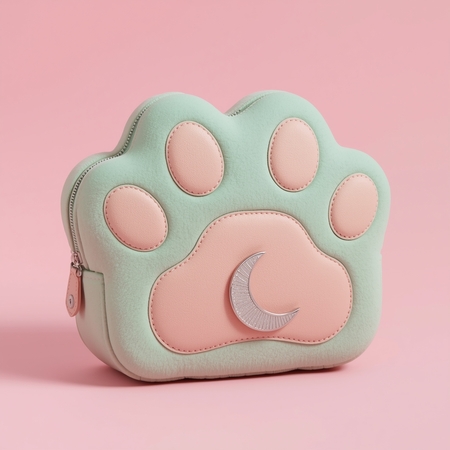 1. A trendy cosmetic bag for a shaving brand, «puffy» style, shaped like a stylized wolf paw print. The main body is in a soft pastel green color, with a central «paw pad» in a delicate pastel pink. A crescent moon-shaped zipper pull in silver. Subtle embroidered claw marks on the sides. Matte, soft-touch eco-leather texture. pink background, soft lighting, product shot, 3D render.