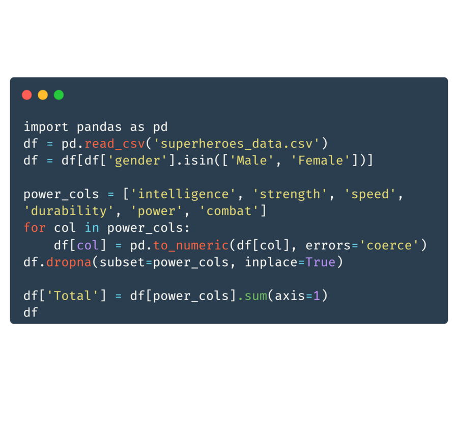 Далее был загружен датасет и выполнена базовая очистка данных: оставлены только персонажи с указанным полом (Male и Female), характеристики (интеллект, сила, скорость, выносливость, мощь, боевые навыки) приведены к числовому формату, удалены строки с пропущенными значениями, рассчитан дополнительный показатель Total Power как сумма всех ключевых характеристик. Эта подготовка позволила в дальнейшем корректно сравнивать персонажей по полу и проводить анализ.
