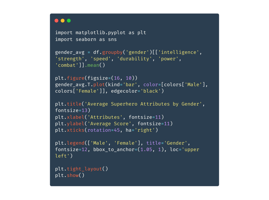 4. ChatGPT — подбор цветовой палитры (промпт: Suggest a color palette (in hex format) that reflects the gender differences in superhero characters and is suitable for dataset visualization), помощь с исправлением возникавших ошибок при написании кода.