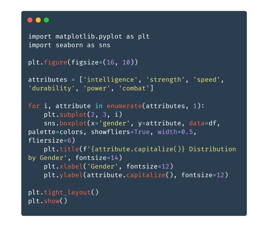 • Описательная статистика — для расчета средних значений характеристик супергероев по полу. Это позволило количественно сравнить типичные значения силы, интеллекта, скорости и других параметров у мужских и женских персонажей.