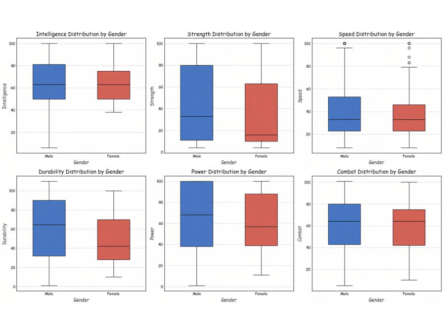 На графике были представлены диаграммы размаха для шести ключевых характеристик персонажей: intelligence (интеллект), strength (сила), speed (скорость), durability (выносливость), power (мощь), combat (боевые навыки), отдельно для мужских и женских персонажей. Каждая диаграмма показывала медианное значение характеристики, межквартильный размах, минимальные и максимальные значения, выбросы (персонажи с экстремально высокими или низкими показателями).