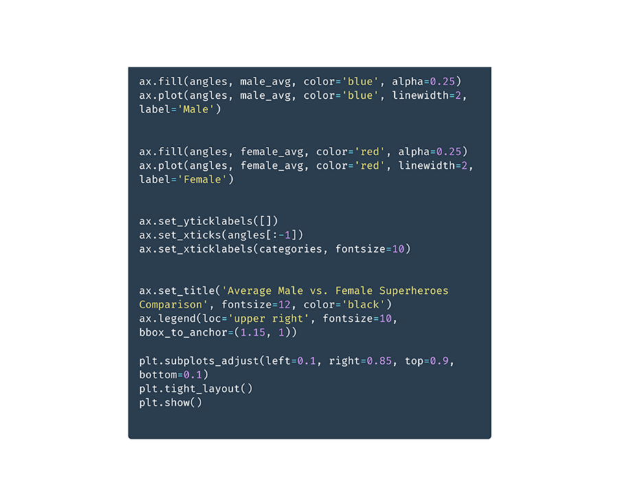 После анализа распределений отдельных характеристик мне было интересно собрать картину целиком и посмотреть, как в среднем выглядит «типичный» мужской и женский супергерой. Для этого я использовала лепестковую диаграмму, которая позволяет одновременно сравнить несколько показателей и наглядно увидеть общий профиль персонажей.