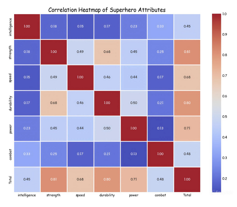 Корреляционный анализ показал, что суммарная мощь персонажа в наибольшей степени формируется за счет физических характеристик. Наиболее сильные связи наблюдаются между: 1. strength и durability (≈ 0.68) 2. strength и Total (≈ 0.81) 3. durability и Total (≈ 0.80) 4. power и Total (≈ 0.71).