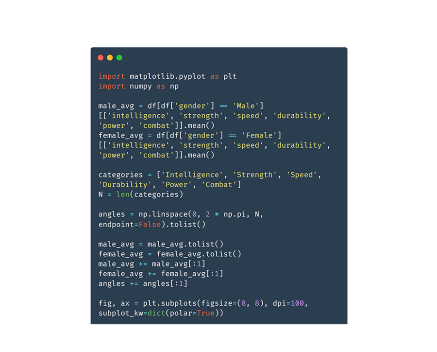 График показал, что мужские персонажи в среднем превосходят женских по физически ориентированным характеристикам — силе, выносливости и мощности. При этом различия в интеллекте и боевых навыках значительно менее выражены. В целом лепестковая диаграмма подтверждает существование гендерной асимметрии в репрезентации способностей супергероев: мужчины чаще изображаются как физически доминирующие персонажи, тогда как женские образы выглядят более сбалансированными, но с меньшим акцентом на грубую силу.