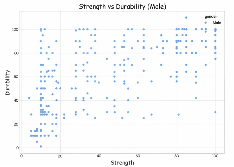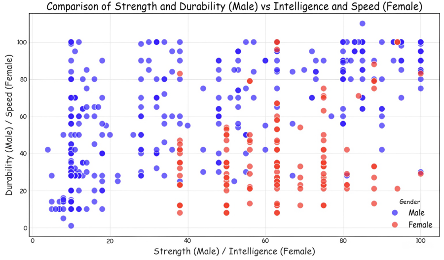 Мужские персонажи в целом чаще формируются вокруг физических параметров — прежде всего силы и выносливости, которые между собой демонстрируют устойчивую положительную связь. Это отражает традиционный образ героя, ориентированного на прямое противостояние и физическую устойчивость. Женские персонажи, напротив, чаще характеризуются сочетанием интеллекта и скорости, что указывает на иной тип героизма — основанный на мышлении, реакции и тактическом превосходстве. При этом супергероини демонстрируют не меньшую вариативность и потенциал, а различия проявляются скорее в акцентах, чем в общем уровне «мощи».