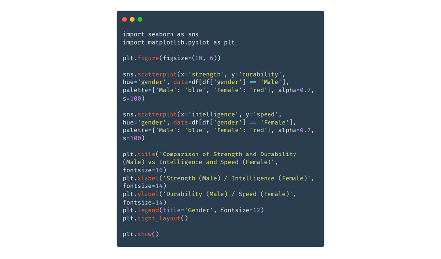 Для визуализации данных я решила выбрать палитру, которая отражает характер супергеройских комиксов и перекликается с броскими образами персонажей. Вдохновением также послужили стереотипные цветовые ассоциации с полами — мужские персонажи обычно ассоциируются с более темными и холодными оттенками, а женские — с яркими и энергичными.