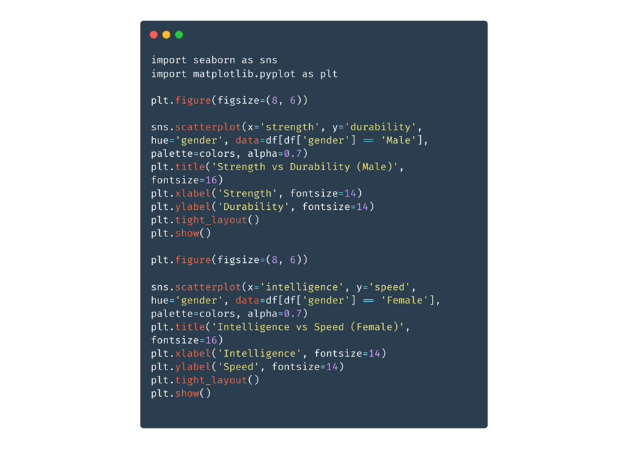 После анализа средних значений и распределений характеристик необходимо было выяснить не только, кто сильнее или умнее в среднем, но и как именно эти способности сочетаются внутри каждой гендерной группы. Для этого я перешла к диаграммам рассеяния, которые позволили увидеть взаимосвязь между двумя ключевыми характеристиками одновременно.