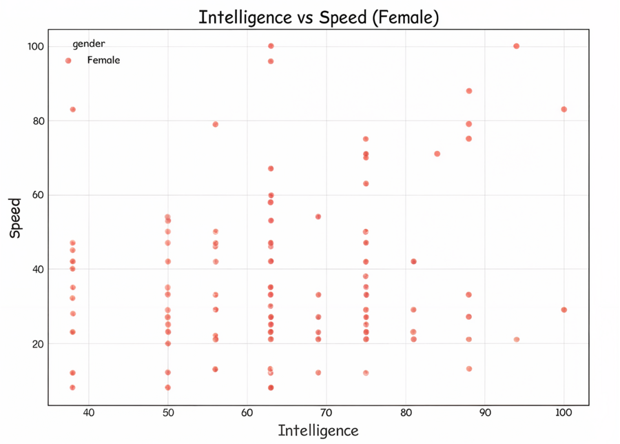Этот график наглядно продемонстрировал, что для мужских персонажей наблюдается выраженный кластер, где высокая сила часто сочетается с высокой выносливостью. Это формирует образ физически доминирующего, устойчивого героя, ориентированного на прямое силовое противостояние. В то же время у женских персонажей более заметна связка интеллекта и скорости, что указывает на иной тип «мощи» — через тактическое мышление, реакцию и гибкость, а не через физическую устойчивость.