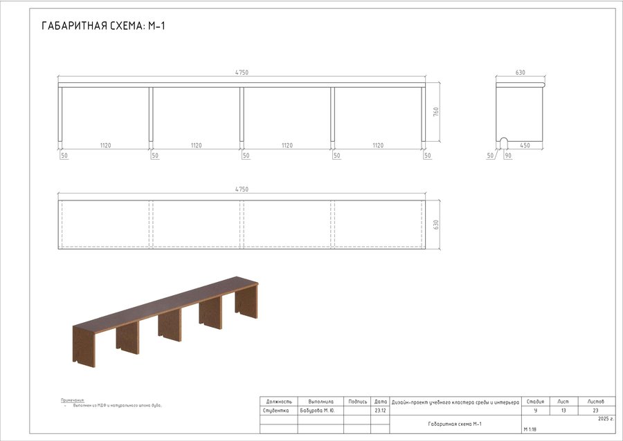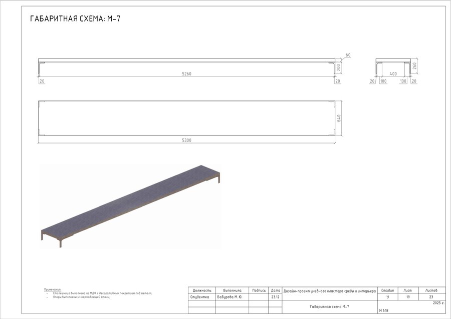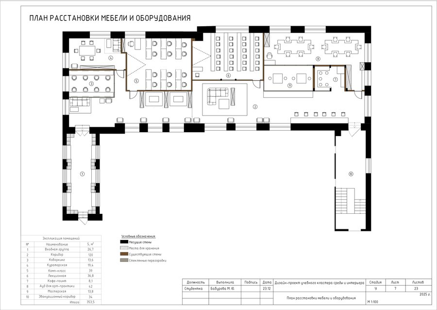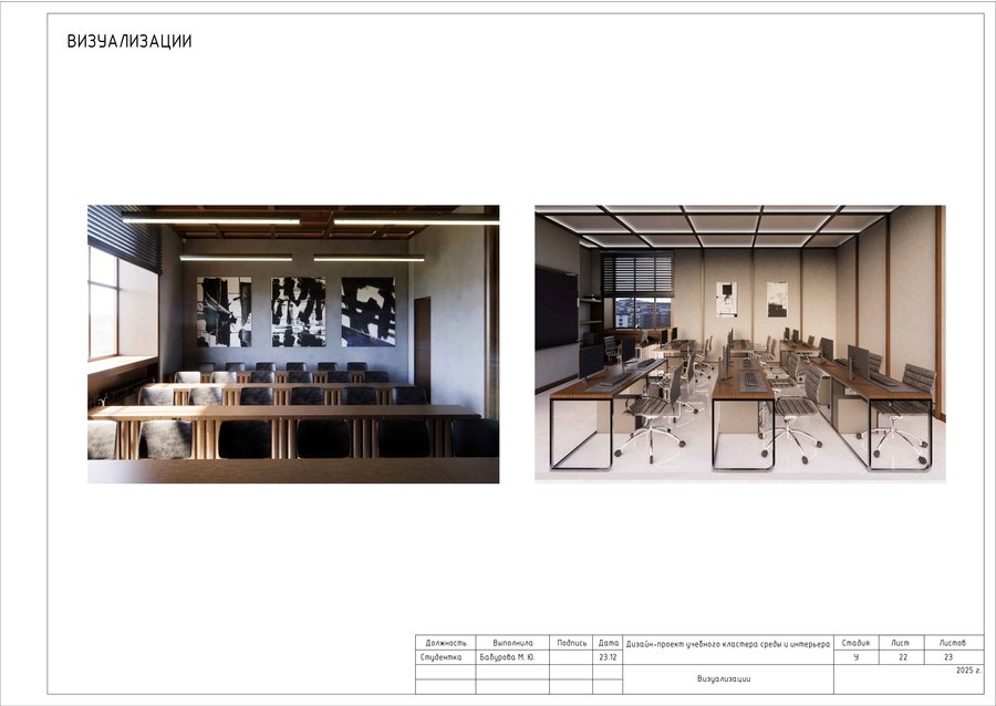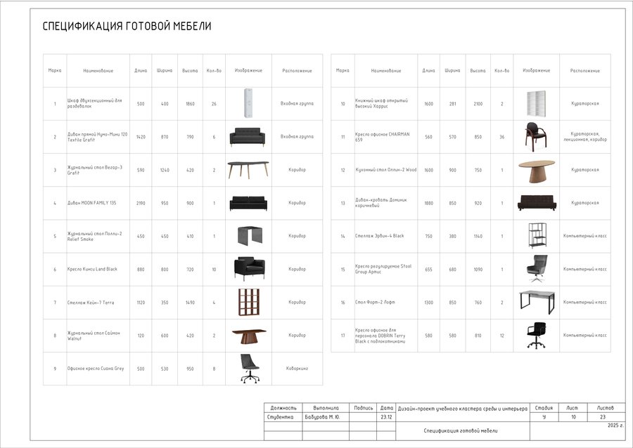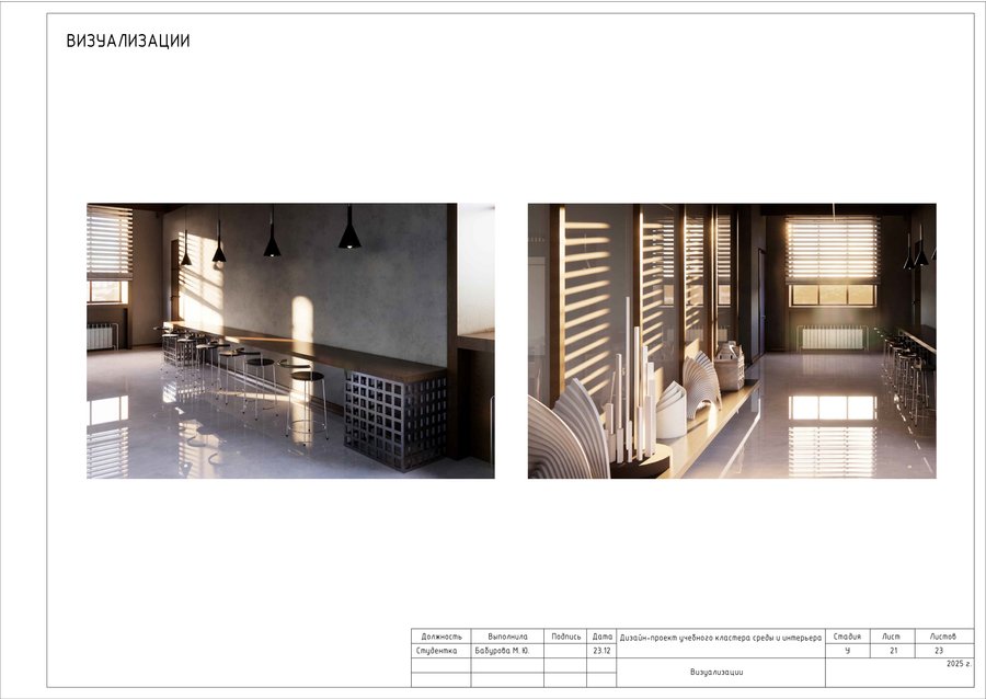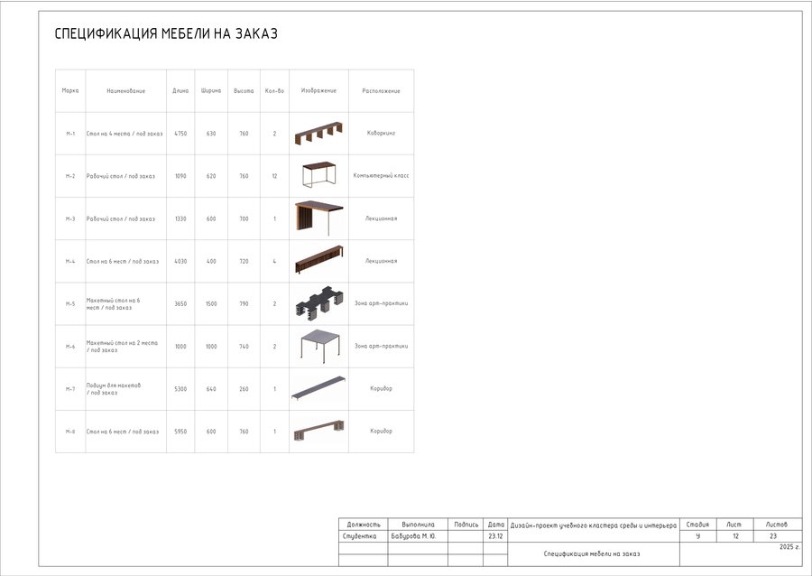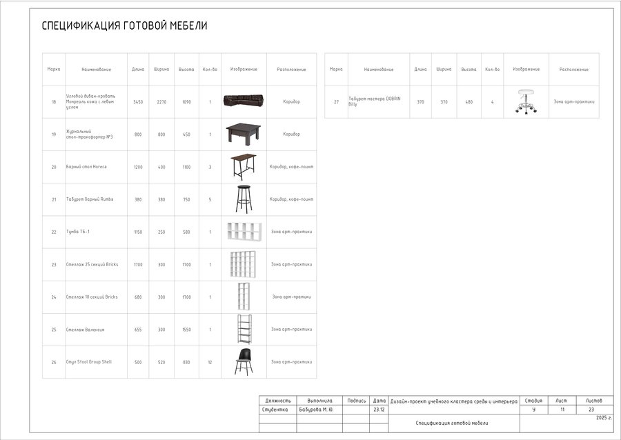 - В рамках модуля стояла задача оформить свой прошломодульный проект учебного кластера дизайна среды и интерьера. В своем альбоме я подготовила различные планы и спецификацию мебели.