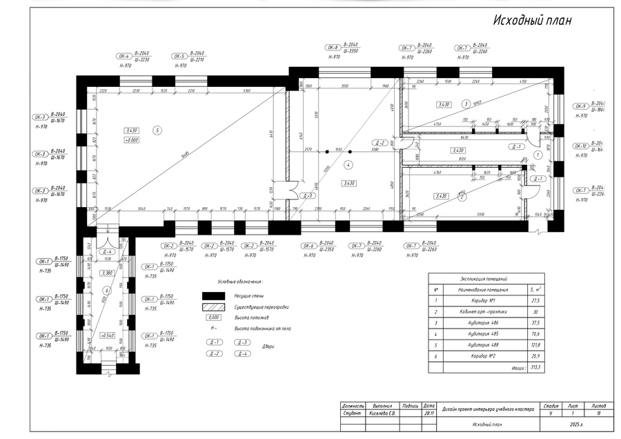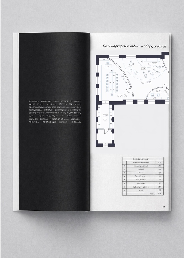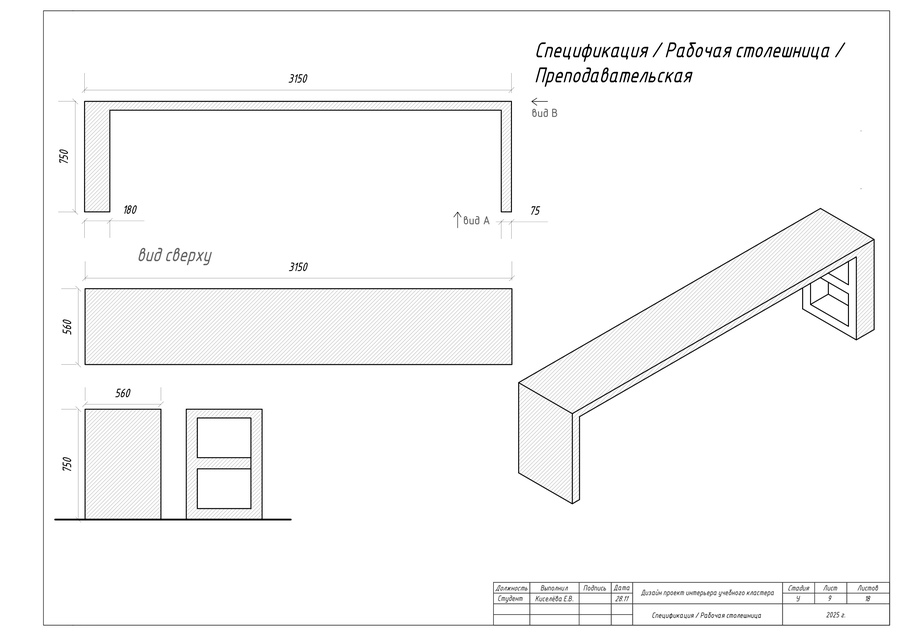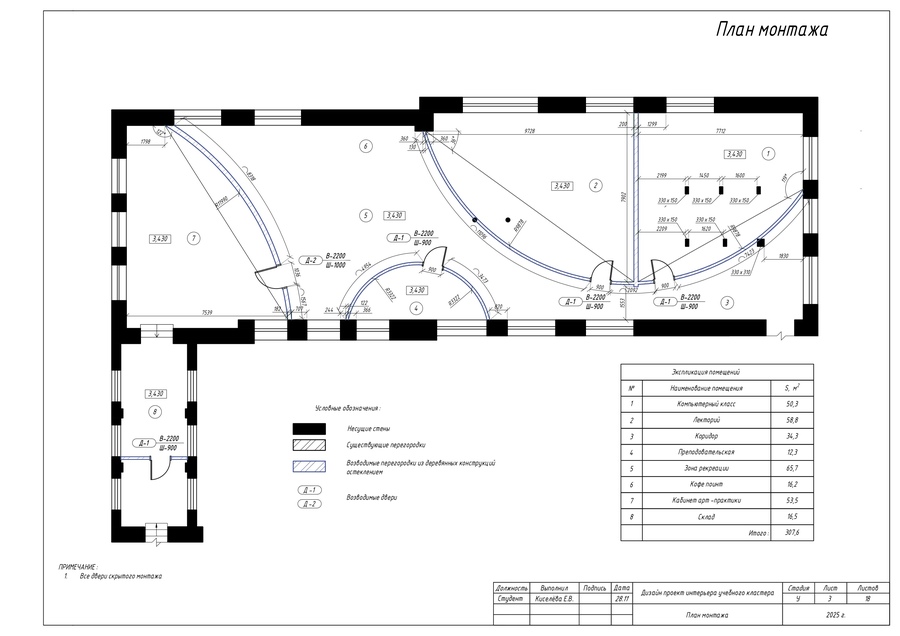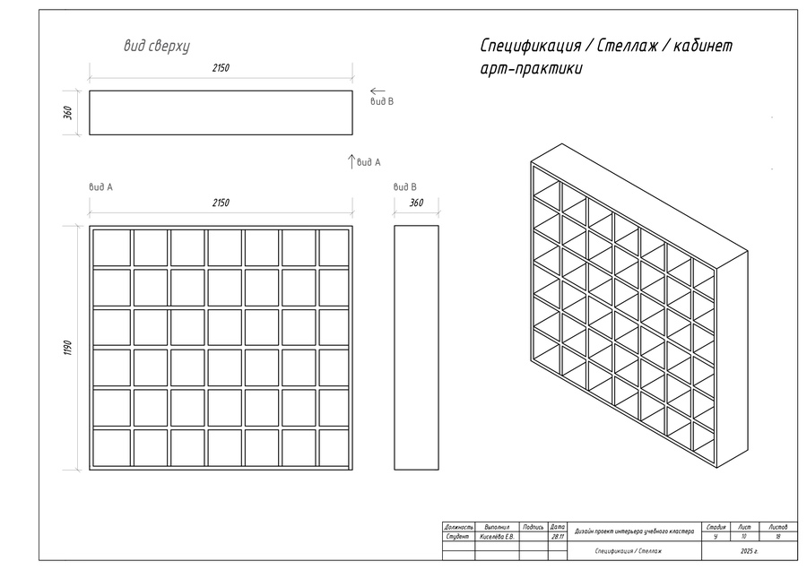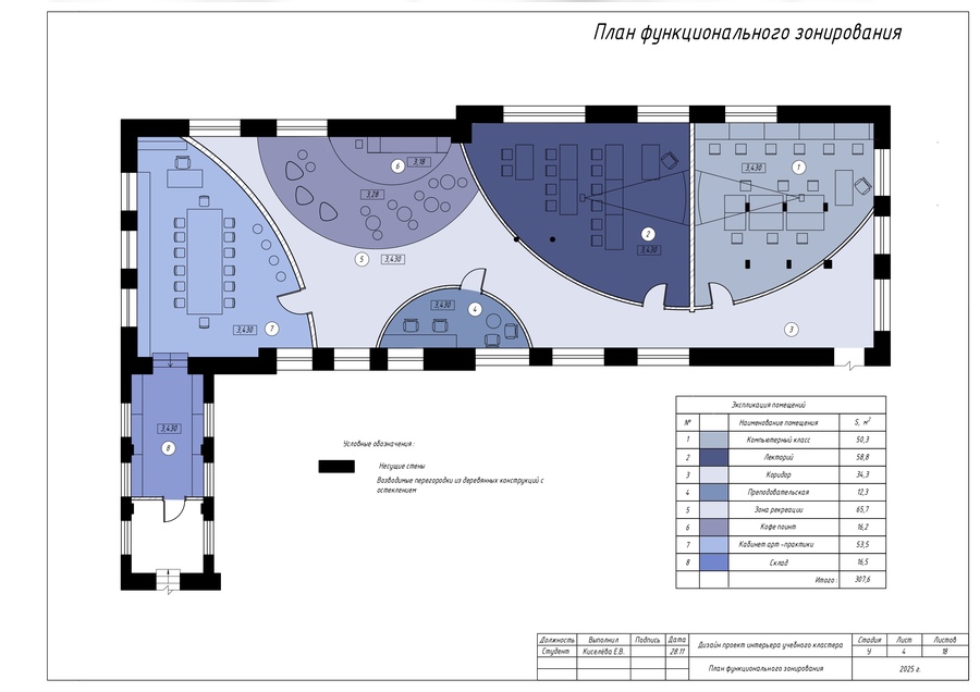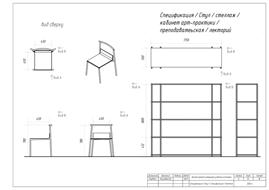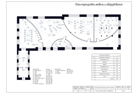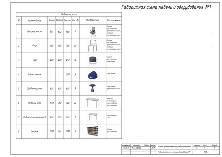 В качестве итоговой работы выполнен ряд чертежей, таких как план учебного пространства, план перегородок по собственному дизайн-проекту кластера, план расстановки мебели и оборудования, а также чертежи мебели