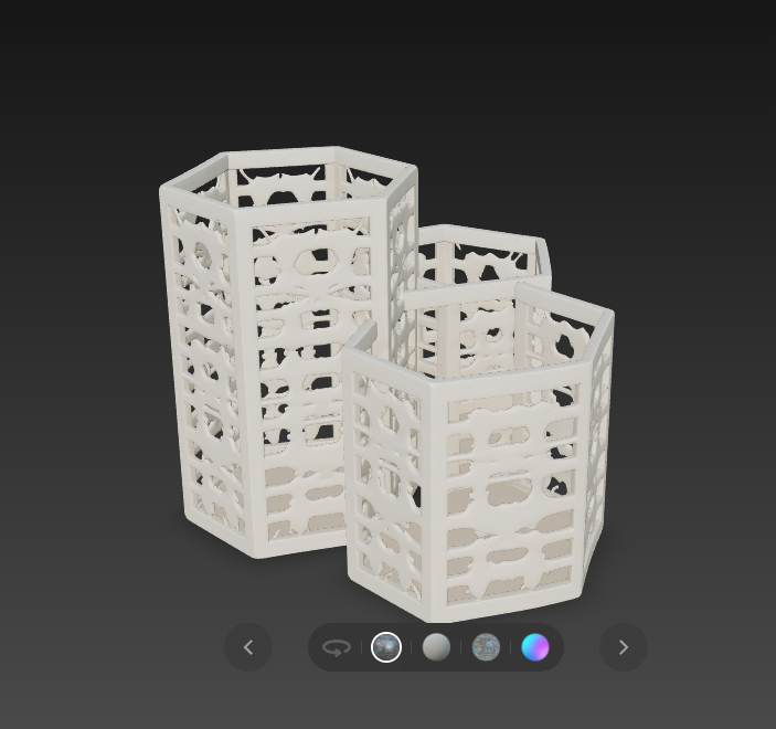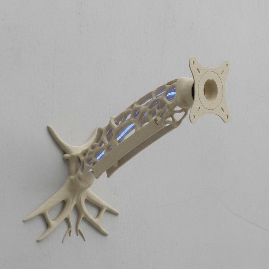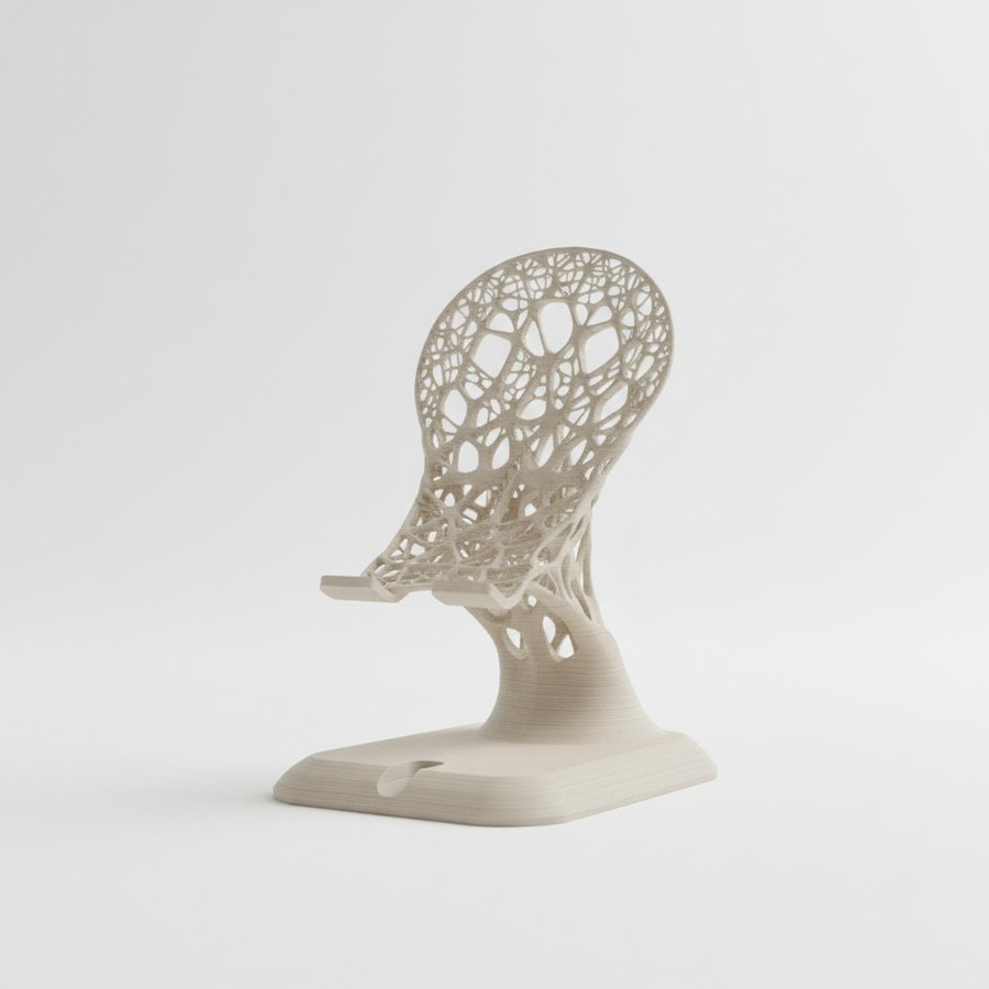 1. Общие требования к стилистике Структура: Параметрическая сетка (Вороной / Lattice), переменная плотность (градиент от сплошного основания к ажурному верху). Цветовая гамма: Матовый белый (арктический), матовый черный или «оружейная сталь» (Gunmetal Grey). Держатель для наушников: 250×120×120 2.5 — 4.0 мм — Усиленное основание для баланса. Органайзер (модуль): 100×80×80 1.5 — 2.5 мм — Гексагональная структура. Лампа-кокон: 180×130×130 0.8 — 1.2 мм — Тонкие стенки для светопропускания. Кронштейн: 150×60×200 4.0 — 6.0 мм — Повышенная плотность заполнения. Подставка для телефона: 120×90×100 мм