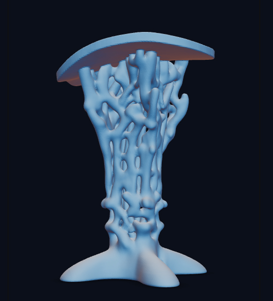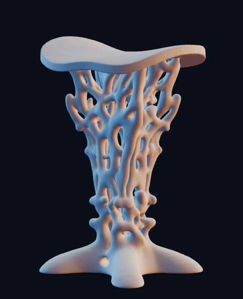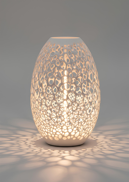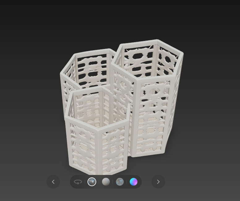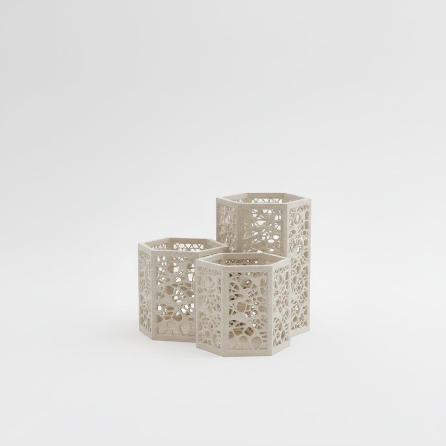 Все объекты объединены единым «паттерном Вороного» или решетчатой структурой, которая плотнее у основания и становится более ажурной к верху.