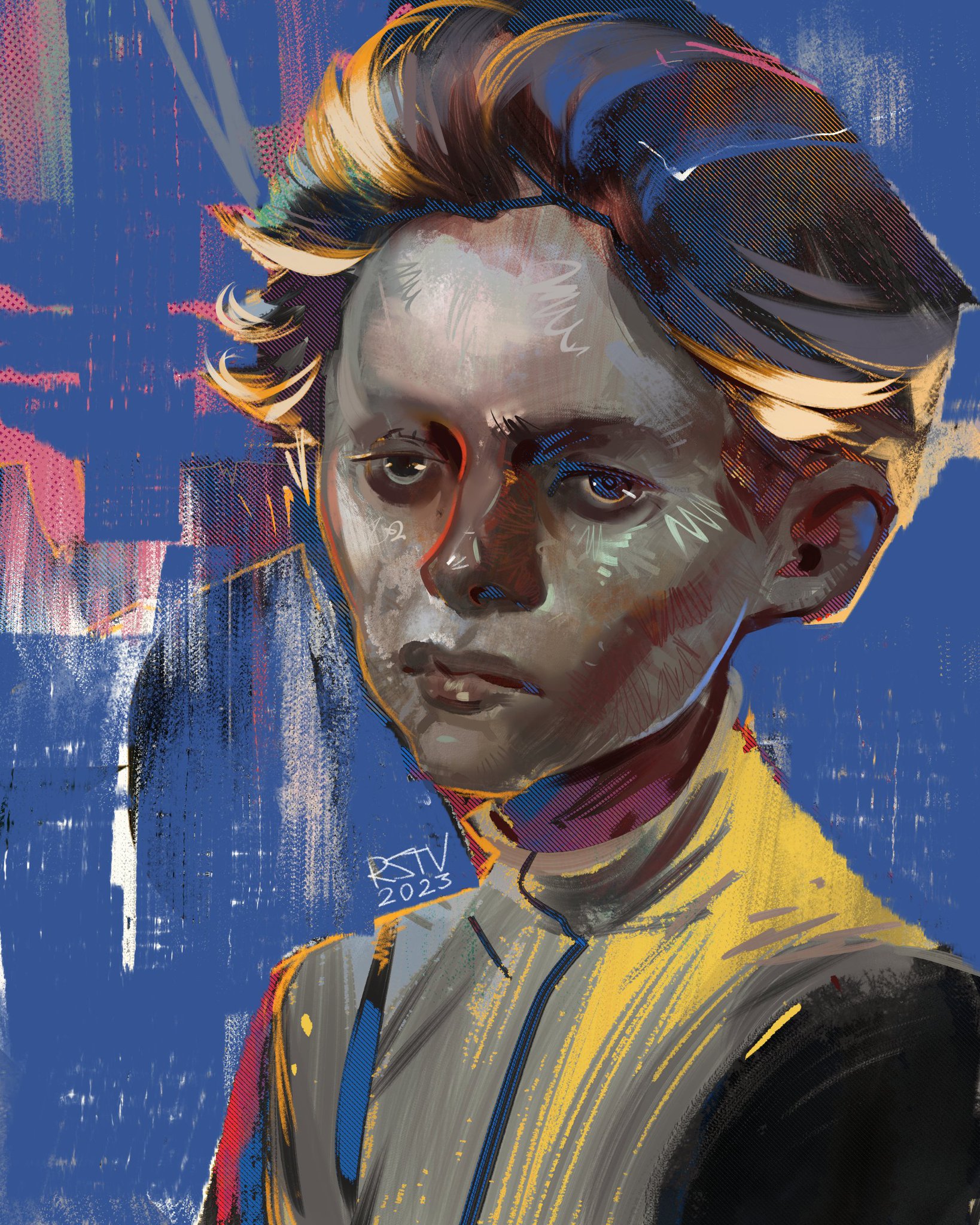 В своей авторской графике Ростов выстраивает модели реальности, в которых постоянно присутствуют следы психического нарушения, пселизм сознания и попытки собрать себя по осколкам. Его персонажи существуют в состояниях утраты опоры: то в них проступает тревога, то — пустотность, то — отчуждение от собственного тела. Художник активно использует мотив «глитча» — сбоя, визуального нарушения, которое разрушает привычную целостность изображения. Лицо может быть разорвано на фрагменты, черты — смещены, глаз — раздвоен, силуэт — ломаться, будто сознание персонажа дало трещину. Во многих работах возникает ощущение «послевремения»: времени, которое застыло, не движется, существует как ошибка в историческом потоке. Сюжеты, иллюстрироваемые Ростовым, словно происходят «между» — между прошлым и будущим, между воспоминанием и забыванием, между состояниями сознания. Большинство его иллюстраций — это портреты по плечи, где главный акцент сделан на взгляд и выражение лица. Именно в этих микрожестах, в напряжении мимики и неустойчивости черт раскрывается внутренняя драма героев. Через визуальный язык — резкие мазки, размытости, искажения, разрывы контуров — Ростов создаёт мир, в котором психическая хрупкость становится основным смысловым каркасом. Его сюжеты строятся вокруг внутреннего кризиса личности, поиска идентичности, столкновения с собственными страхами и сломанными воспоминаниями.