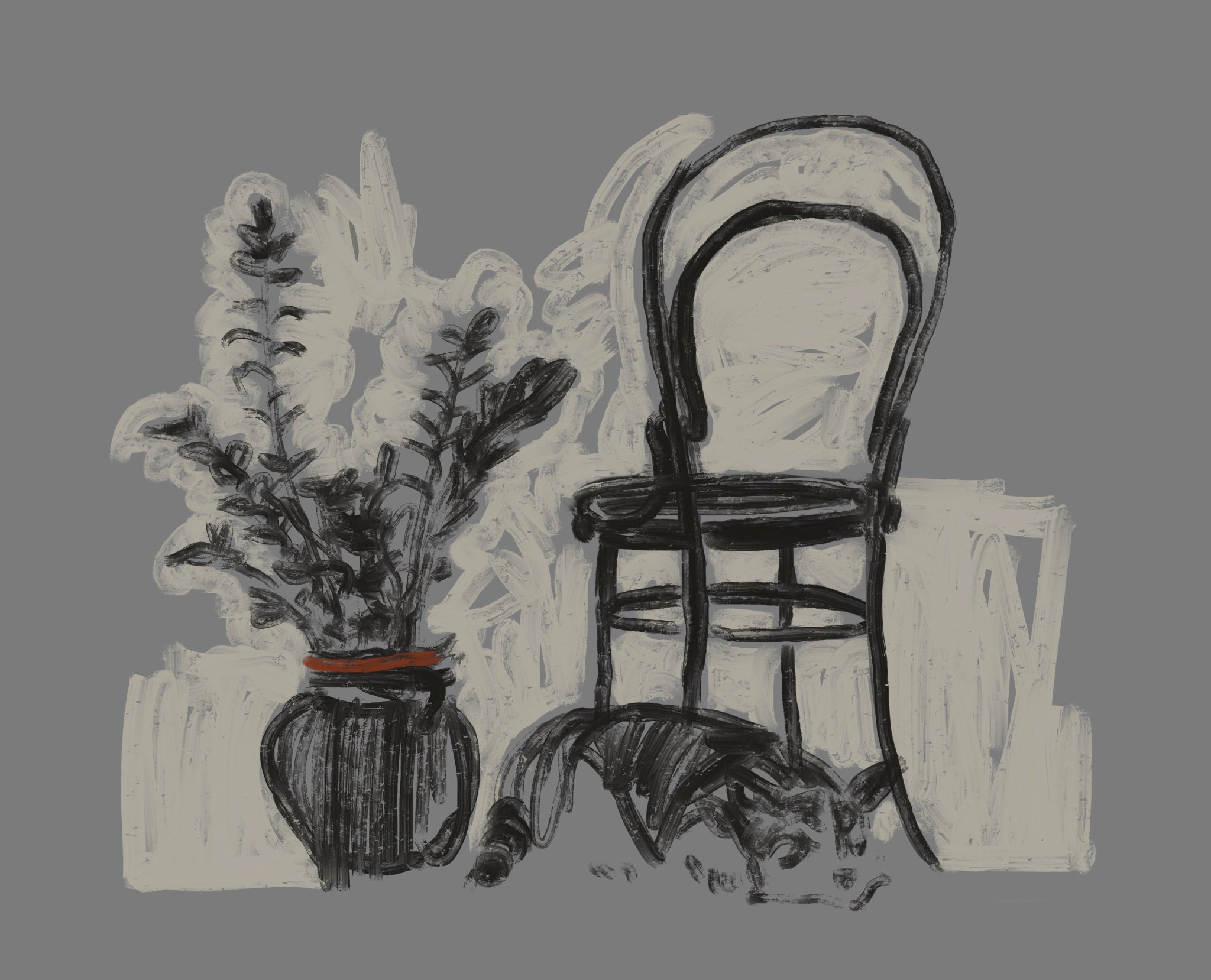 Александр Ростов. Этюд апартаментов с растением, стулом и Зогом утром, 2025 г.