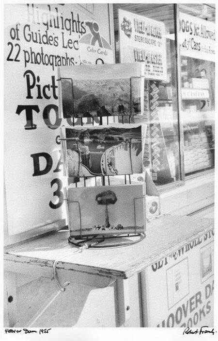 В работе «Плотина Гувера» величественный символ инженерного прогресса снят как унылый техногенный пейзаж. Отсутствие человеческих фигур подчеркивает холодность технологической утопии. Таким образом, Франк отражает критический взгляд на миф о покорении природы.